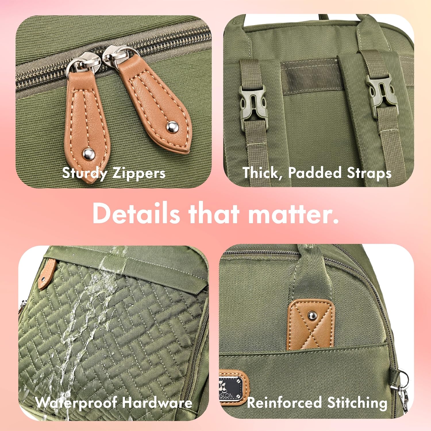 - Durability to last: Our maternity backpack diaper bag is crafted from lightweight and waterproof polyester fabric. Includes spill-resistant and easy-to-clean lining. You don't need to fear spilled milk or water. Non-fraying stitching, easy-tote top handle, back ergonomic design and thick padded cushioned shoulder straps will release stress and bring comfort while carrying.