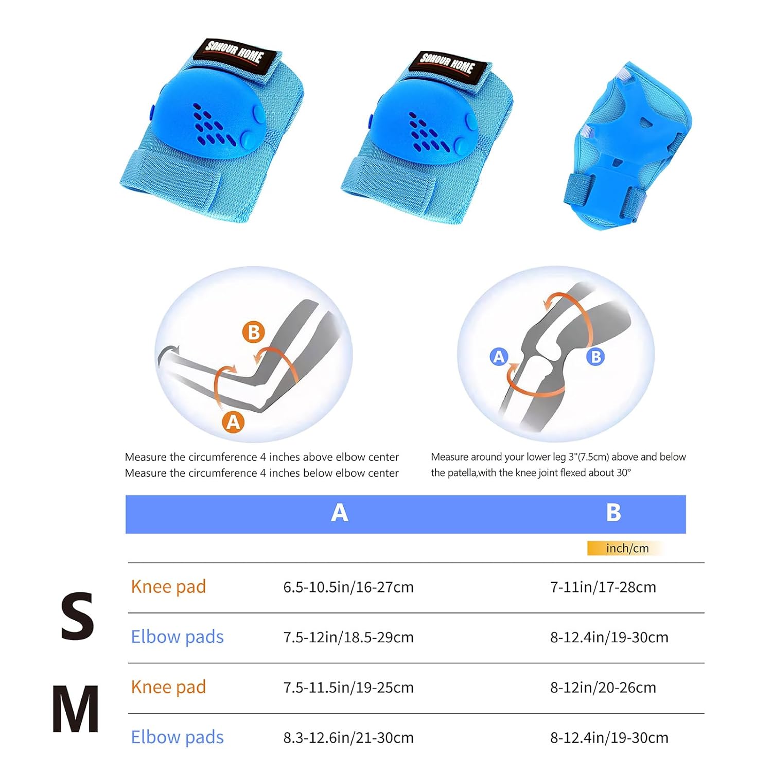 - 🌸【Recommended Age for Kids 】SOHOUR HOME Kids Knee Pads and Elbow Pads 6 pack contains: 2 pcs Knee pads /2 pcs Elbow Pads / 2 pcs Wrist Guards With Portable Breathable Canvas Mesh Bag. Size Suggest: S: for 3-7 Years old, M: for 6-15 Years old.