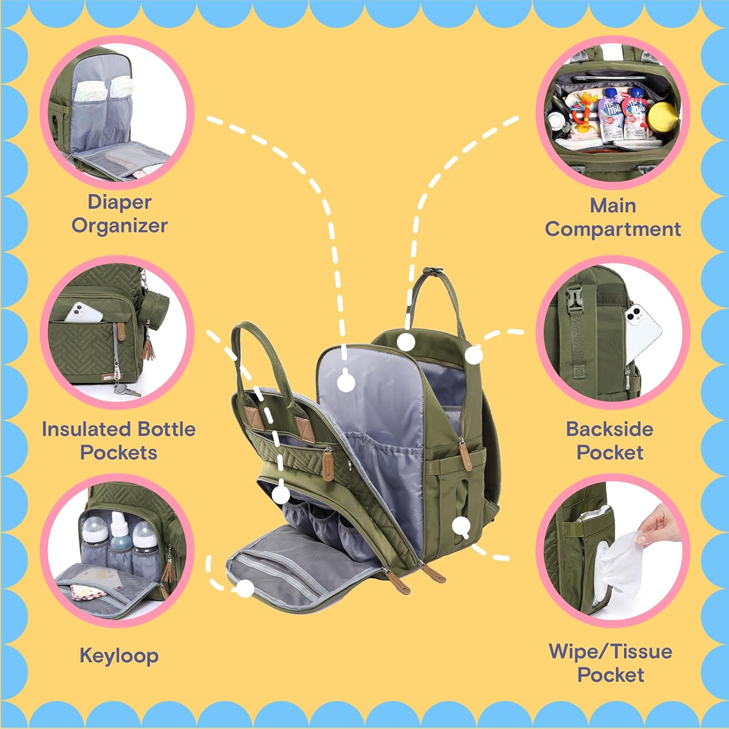 - 4 in 1 Diaper Bag: All-in-one design includes a diaper backpack, a diaper pouch, a washable changing pad, a pacifier case, and built-in stroller straps. The water-resistant outer fabric and lining make for the clean and mess-free organization for all necessities. With the fashion outlook, it will even be used long after the diapering stage.