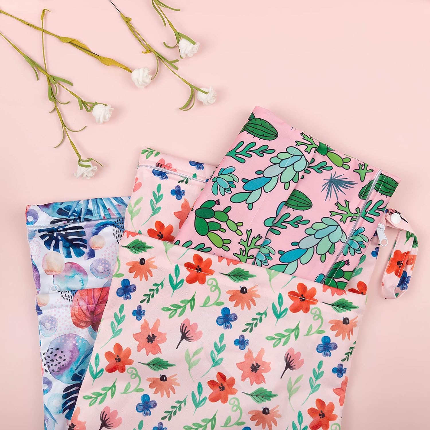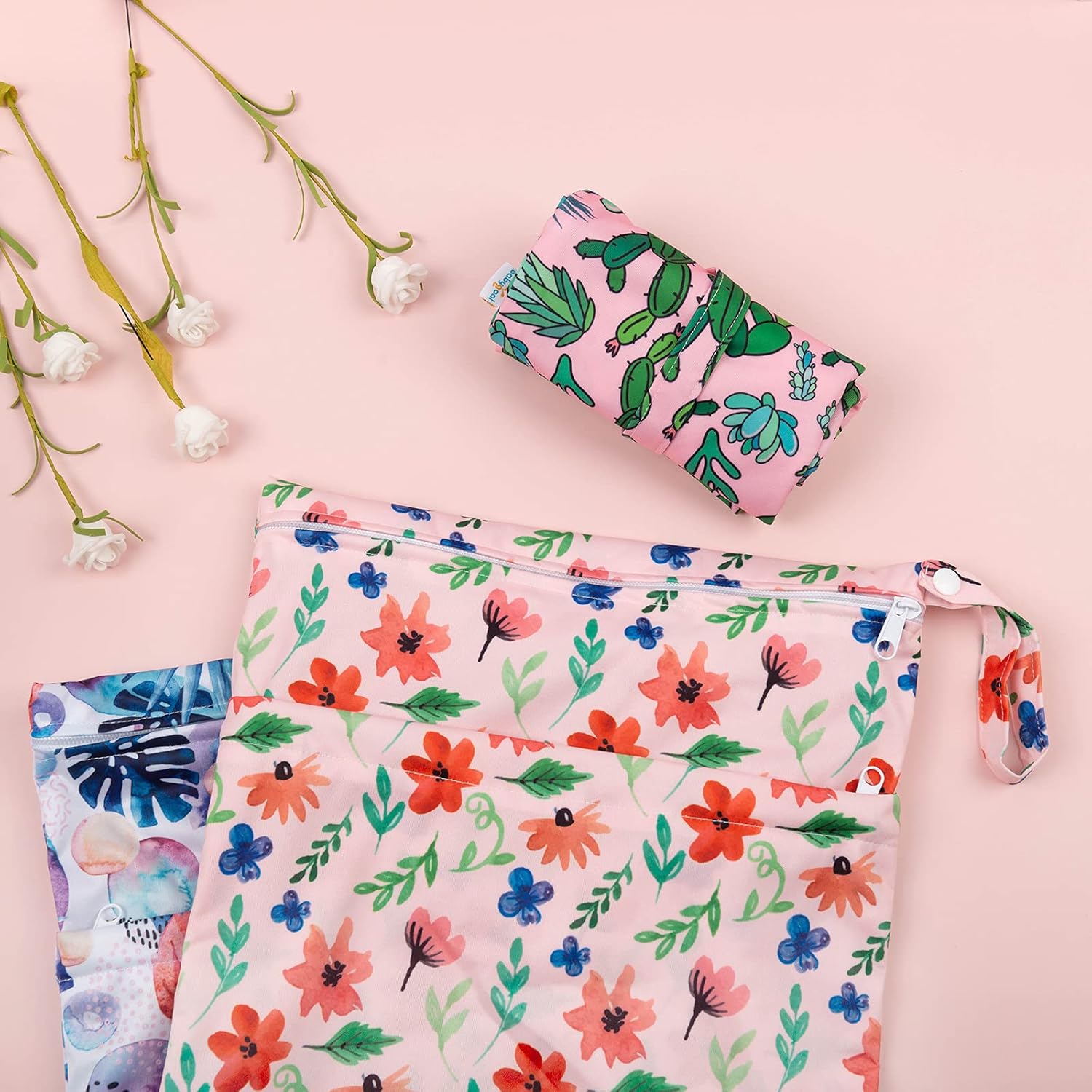 - Double-Pocket Design with Snap Handle: Each wet bag contains two pockets, which comes with two zip closures to ensure that nothing will drop out of the bag and better to keep the clean and dirty items separately. With the snap handle design, you can unbutton the haddle and easily hang the bag on the stroller or door knobs, towel rod ect. anywhere you want.
