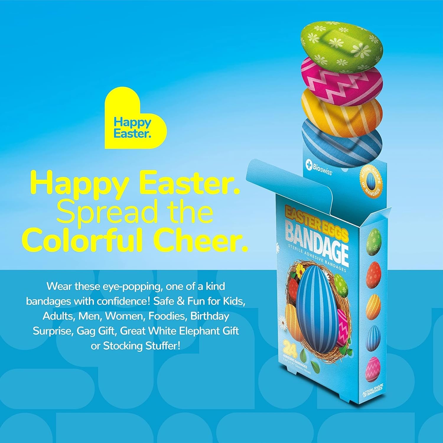 BioSwiss Bandages, Easter Egg Shaped Self Adhesive Bandage, Latex Free Sterile Wound Care, Fun First Aid Kit Supplies for Kids, 24 Count