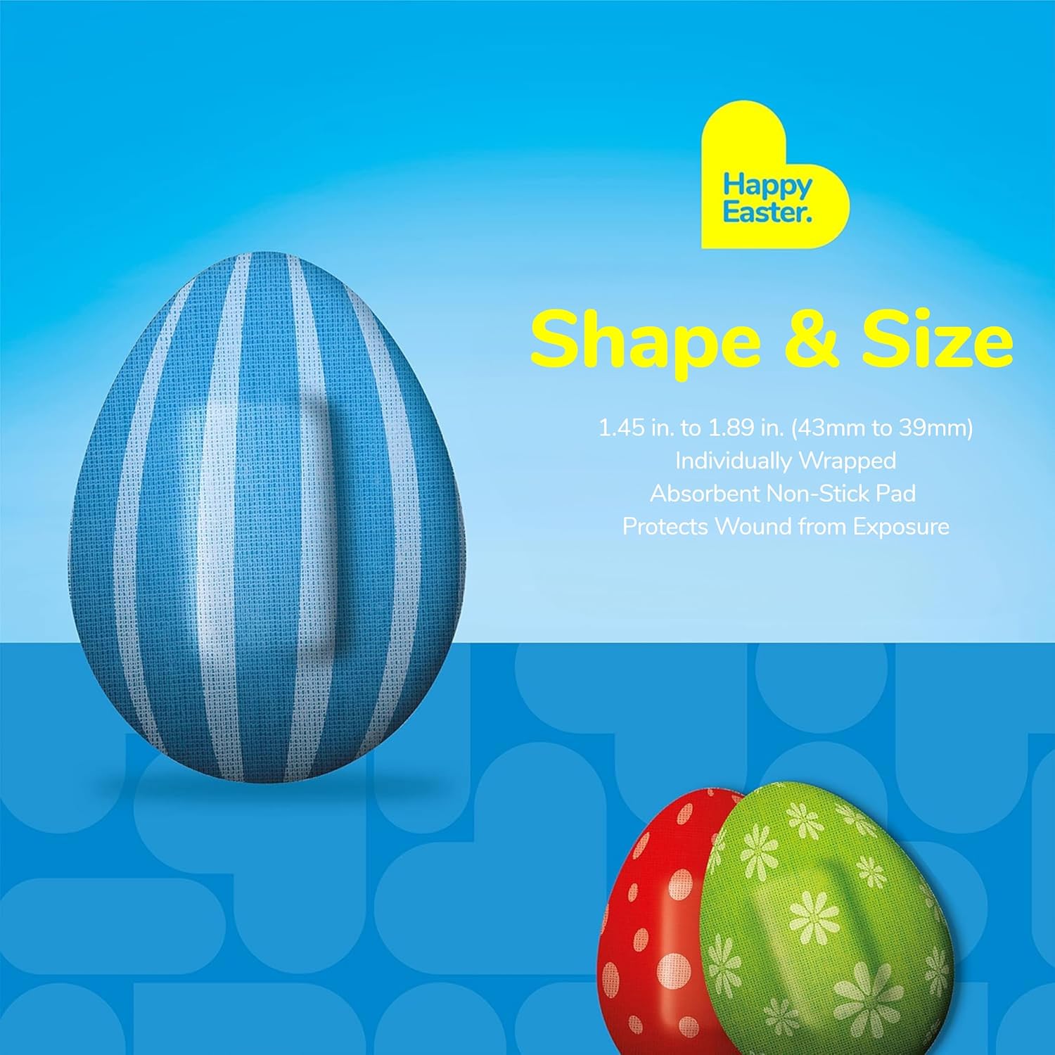 - EASTER EGG BANDAGES: This 24 piece pack of adorable Easter eggs bandages is great for putting a smile on kids' faces while protecting wounds such as cuts, scrapes, and burns, and come in 5 assorted styles; sticky bandages are perfect for kids and adults alike, and also for school nurses and pediatric doctors