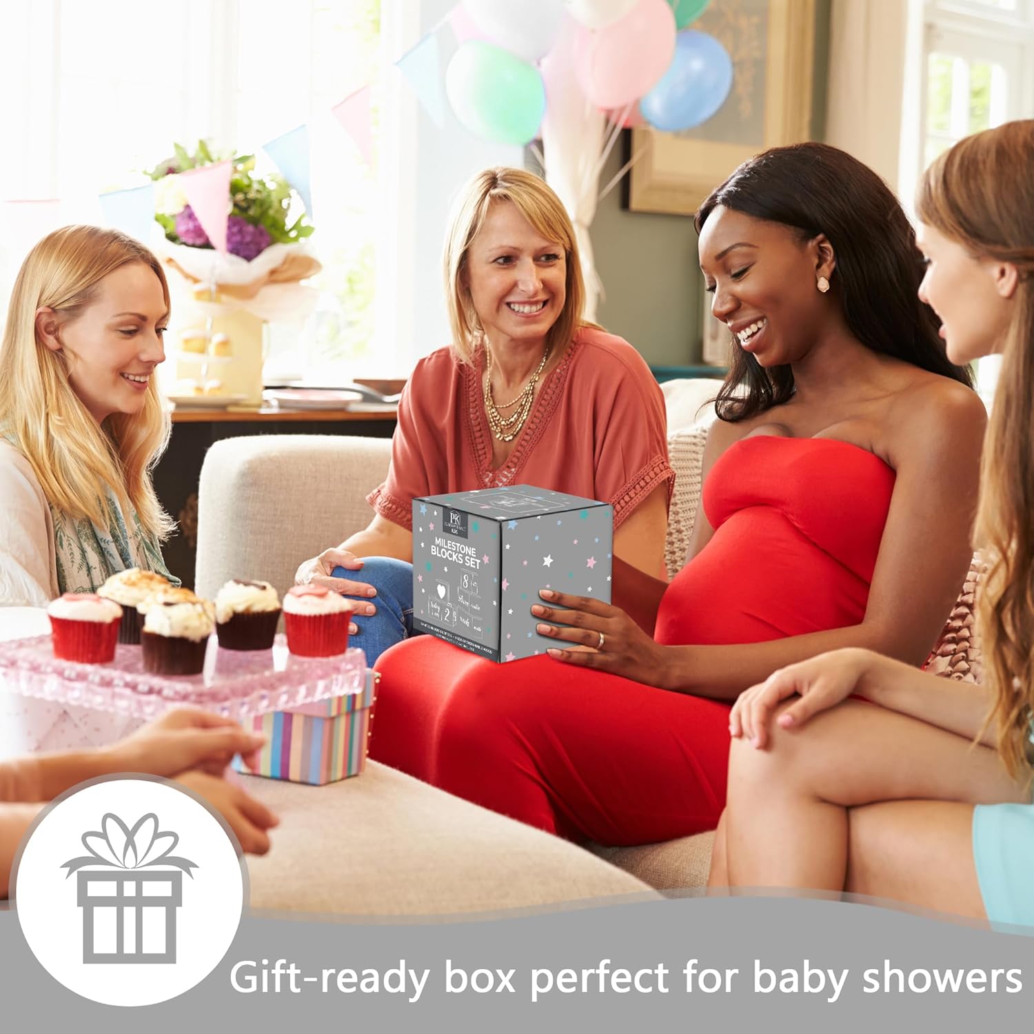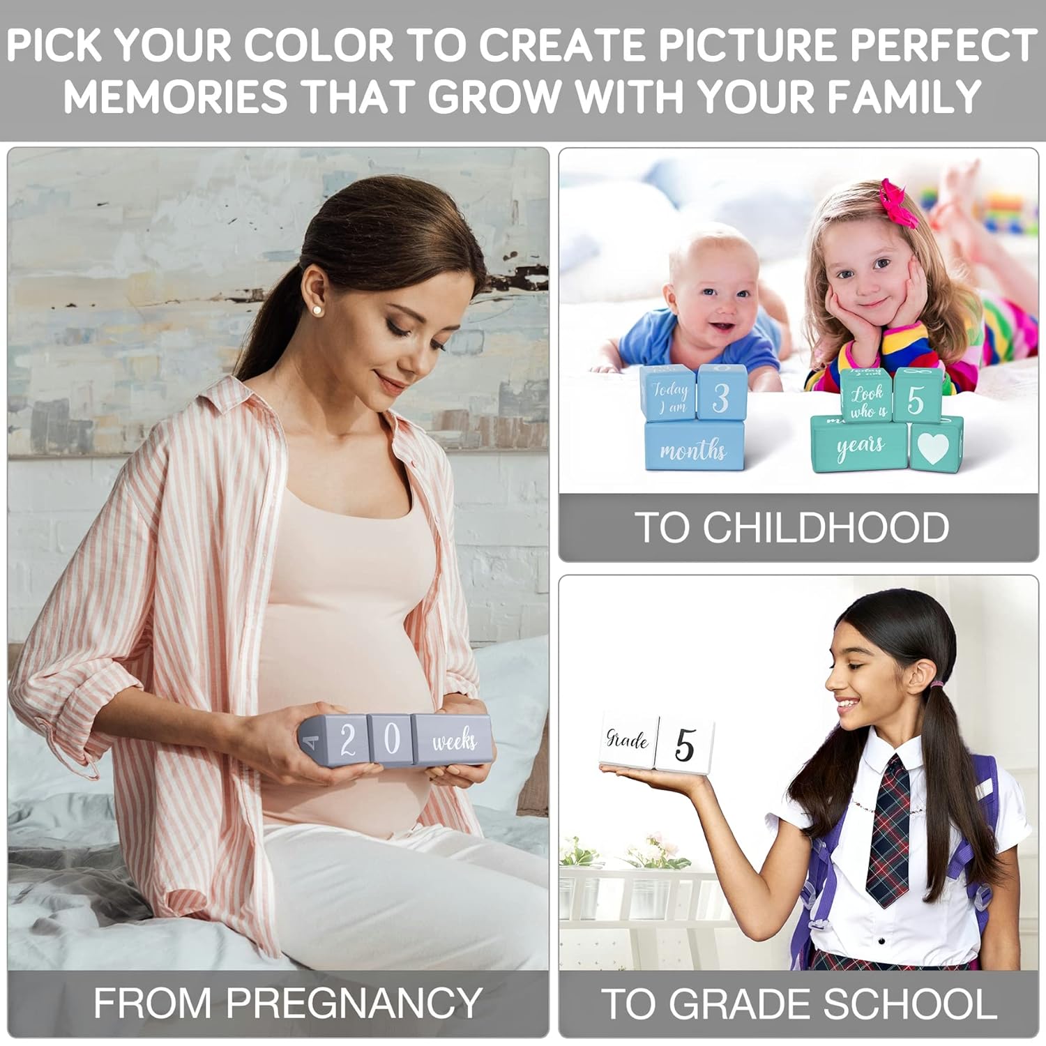 - What’s In The Set? This infant monthly milestone marker set comes with 4 blocks (2.5” cube) and 2 blocks (2.5 x 5” rectangle). Features number blocks (up to 99), plus day, week, month, year, and days, weeks, months, years, events, weight and height. And everything comes in a cute matching storage bag