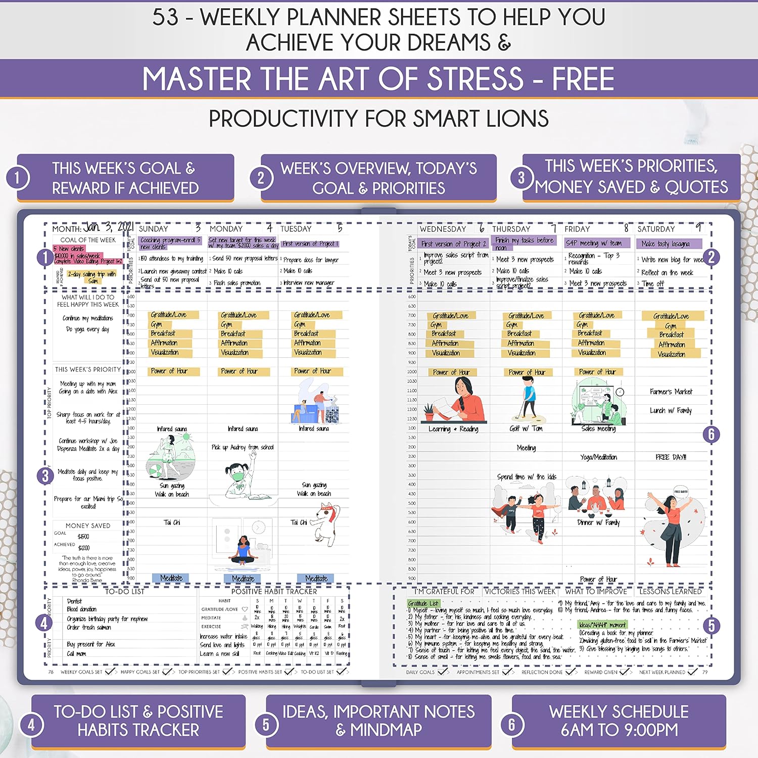 - LIFE PLANNER - Vertical Planner, A5 Size, 212 pages of life transformation, 53 weekly, 12 monthly planning overviews & reflection, 22 dotted journal pages, habit trackers, mind maps, morning & evening routines, inner pockets, pen holder & gift box