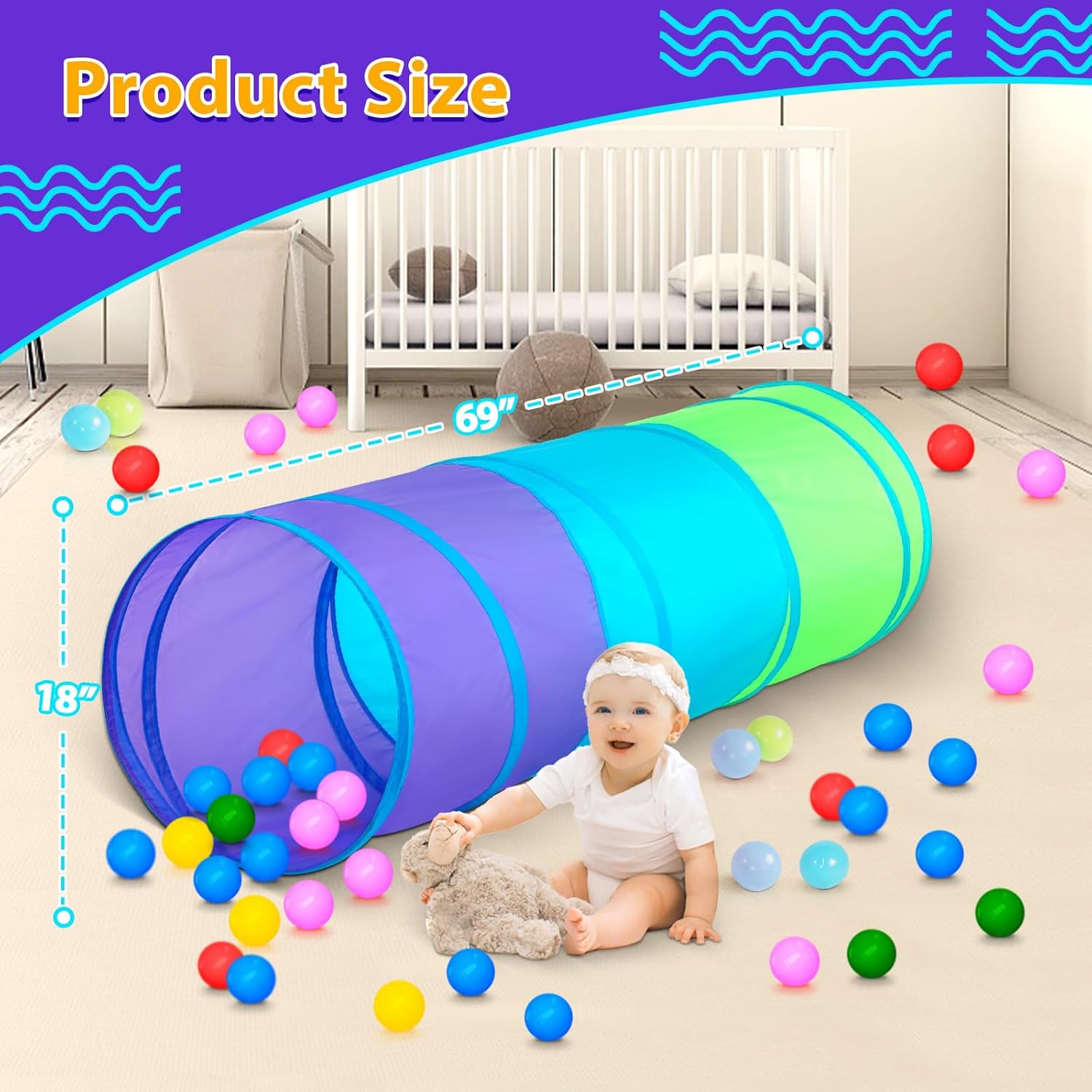 - 【Colorful Tunnel】Our baby tunnel is designed in three colors, the colorful kids tunnel has an irresistible attraction to children. Strong and bright colors help to cultivate children's color sensitivity and aesthetic feeling, enhance color recognition ability, and build a positive and outgoing personality. Babies can enjoy the fun of the play tent by recognizing and perceiving colors.