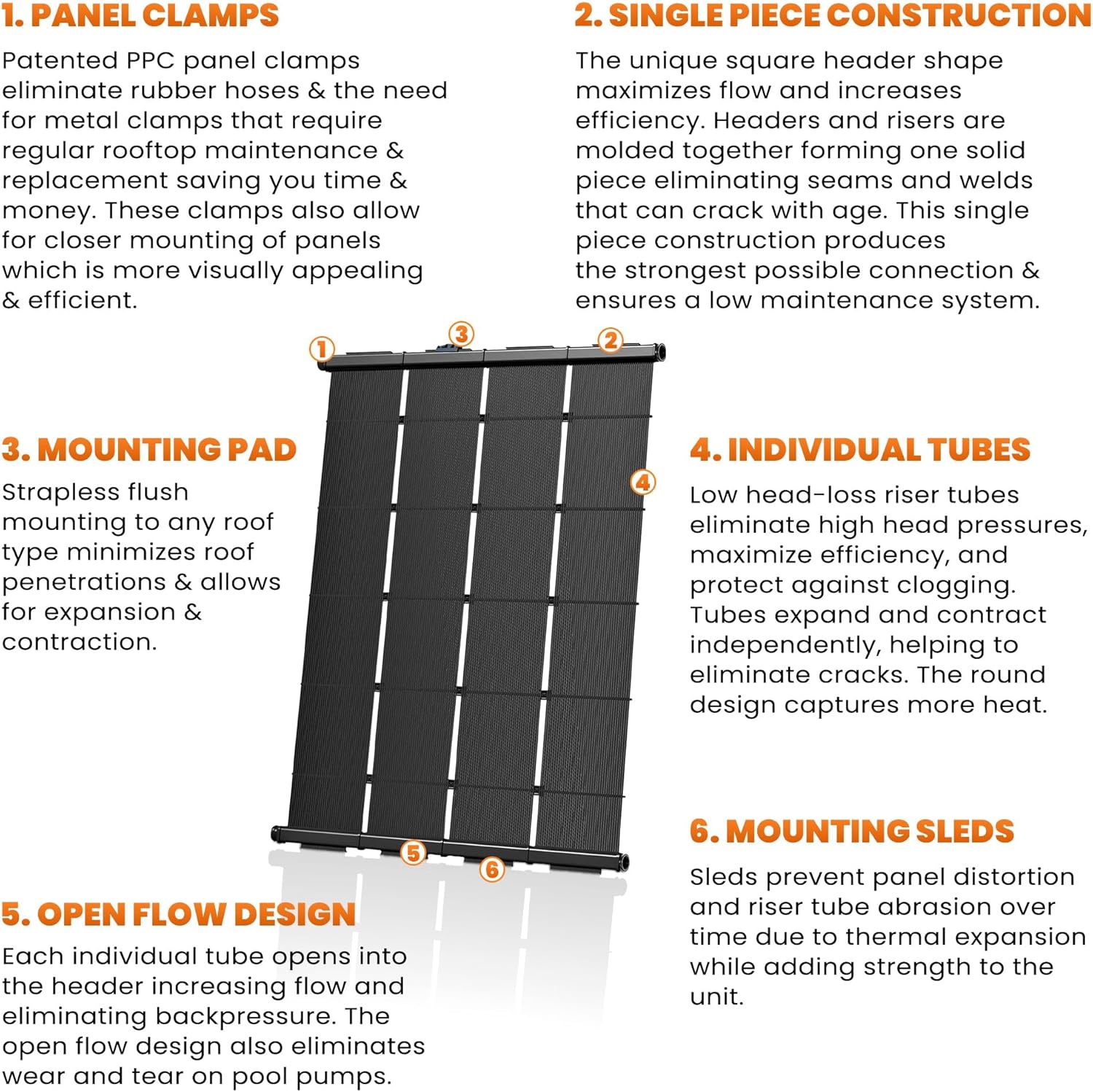 - MAINTENANCE FREE PANEL CONNECTIONS - The industry’s best method for connecting panels together and to PVC pipe. The patented panel clamp system allows panels to be mounted closer together for a more efficient and more attractive system.
