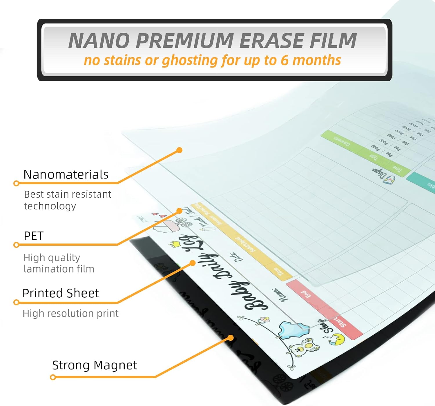 - PLEASURABLE WRITE AND CLEAN: We use the nano premium erase film on our products. Compare to the old PET film, the nano material will make your writing super easy to be wiped off even after leaving the writing on the notes for long time. Let’s say bye to stains and ghosting! We promised it’s 100% erasable!!