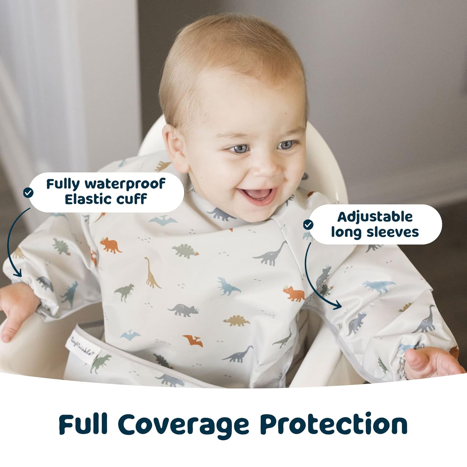 Tiny Twinkle Mess Proof Baby Bib,Waterproof Smock Baby Bib for Eating,Machine Washable Long Sleeve Bib,Baby Led Weaning,Toddler Bib,BLW Supplies(Dinosaur, Small 6-24 Months)