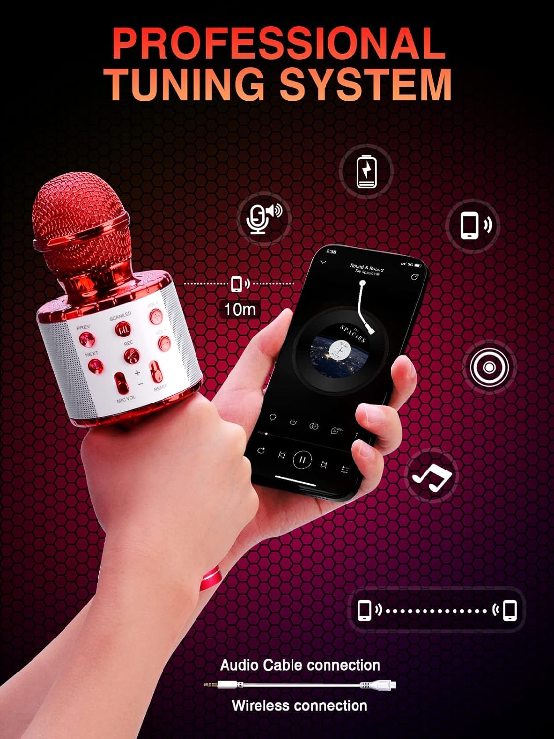 BlueFire 4 in 1 Karaoke Wireless Microphone with LED Lights, Portable Microphone for Kids, Great Gifts Toys for Kids, Girls, Boys and Adults (Red)