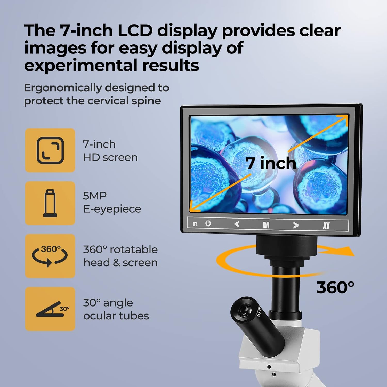 - [Eyepieces & LCD Screen]: Equipped with wide-field 10X/25X glass eyepieces fixed at an ergonomic 30 degree tilt to reduce neck strain, easily adjustable for different interpupillary distances without losing focus, 5MP Electronic eyepiece and 360 degree 7" large LCD display allows you to get a larger field of view directly from the screen without an external large screen display, provide a more comprehensive view and enable sharing. 4 Achromatic objectives offer 4x 10x 40x(s) 100x(Spring Oil).