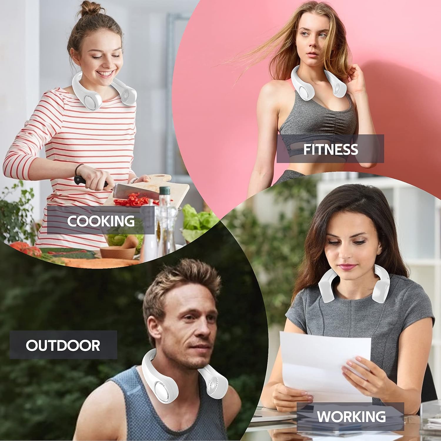 - [Cool down quickly]-Personal fan with 72 wind outlets and 60pcs twin-turbine fan blades,there are air outlets on both sides and at the rear, which can achieve a 360° omnidirectional air outlet and cooling. Neck fan has three speeds to meet different needs.
