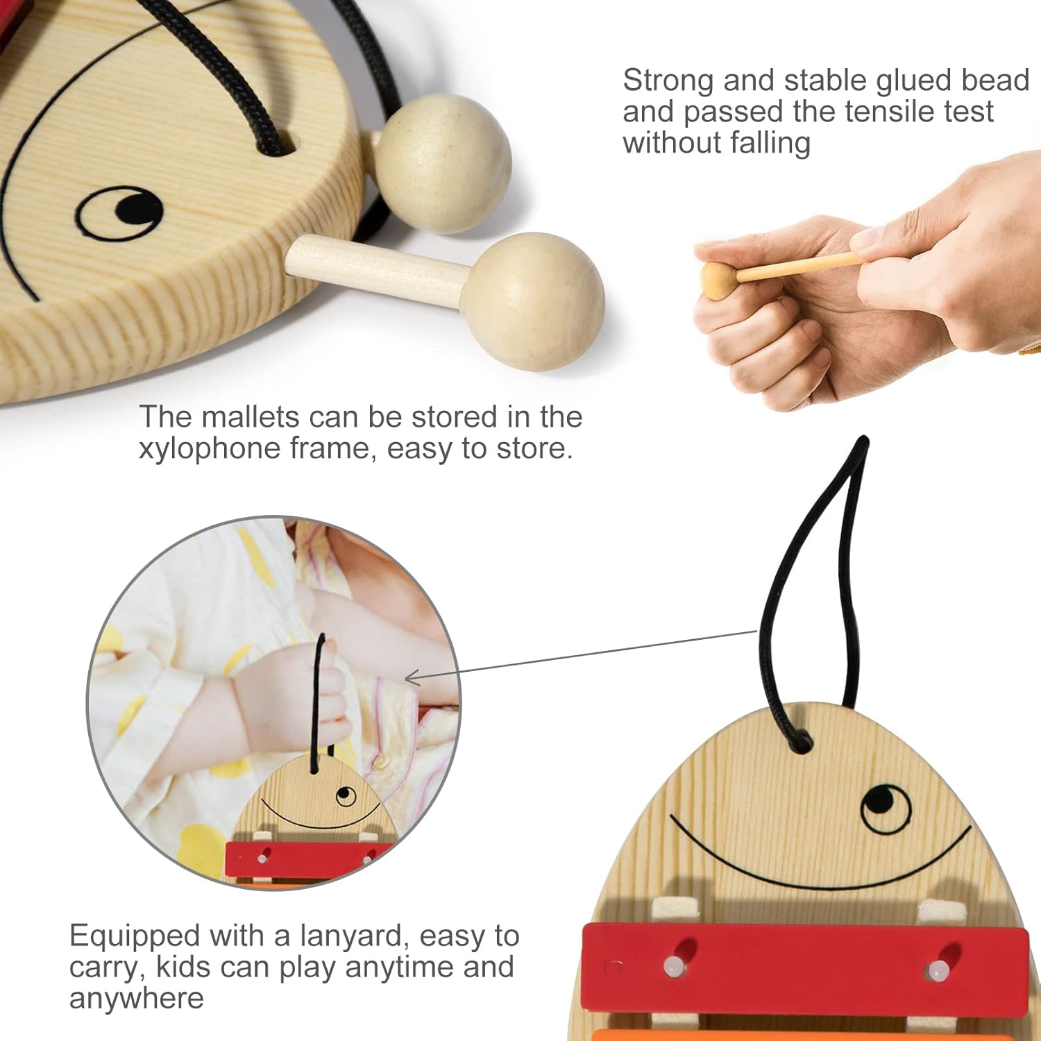 - ♬ Scientific Design: Fish shape design, unique wood box design as a creative move for making our best sound kids xylophone after years of works on kids music instruments. Kids will love this one unique toy instrument for this beautiful looking.