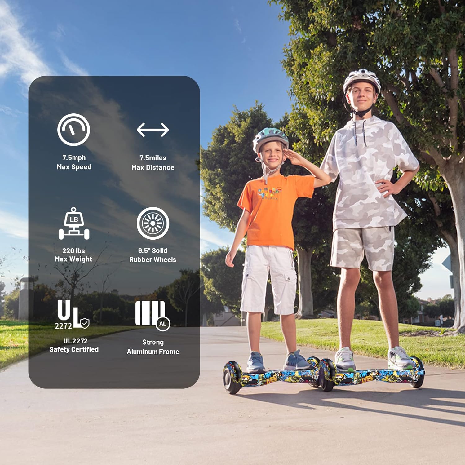- High Performance: 6.5" solid rubber wheels, a strong Aluminum frame, non-slip footpad, 250W dual motors enables it to run at a top speed of 7.5 mph(3 adjustable speed modes), a top range of 7.5 miles, and a max load of 220 lbs. 15-degree slope