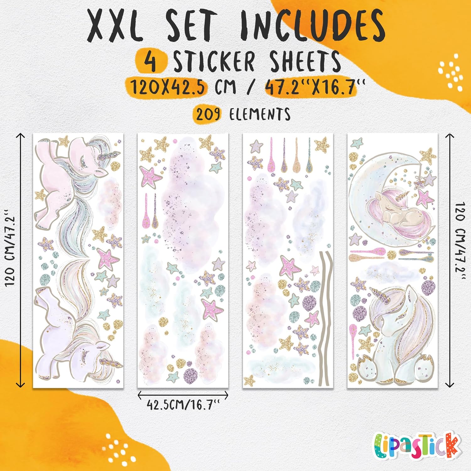 Unicorn Wall Decals by Lipastick - Vibrant Glitter Moon, Stars, Cloud Stickers for Girls Bedroom, Baby Nursery, Kids Room, Birthday Party Decor Art- Peel and Stick Gift Idea- XXL Size