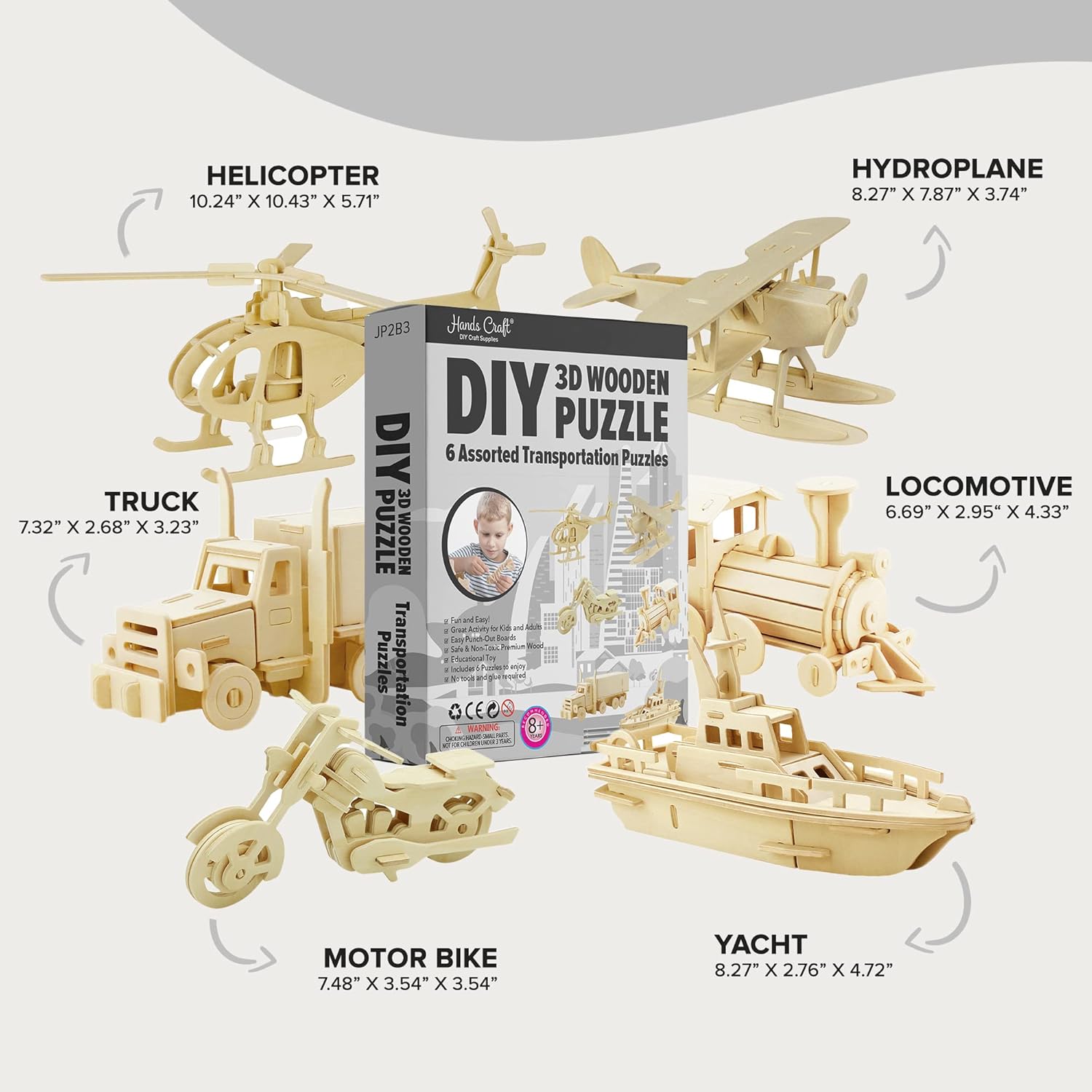 Hands Craft DIY 3D Wooden Puzzle – 6 Assorted Transportation Bundle Pack Set Brain Teaser Puzzles Educational STEM Toy Adults and Kids to Build Safe and Non-Toxic Easy Punch Out Premium Wood JP2B3