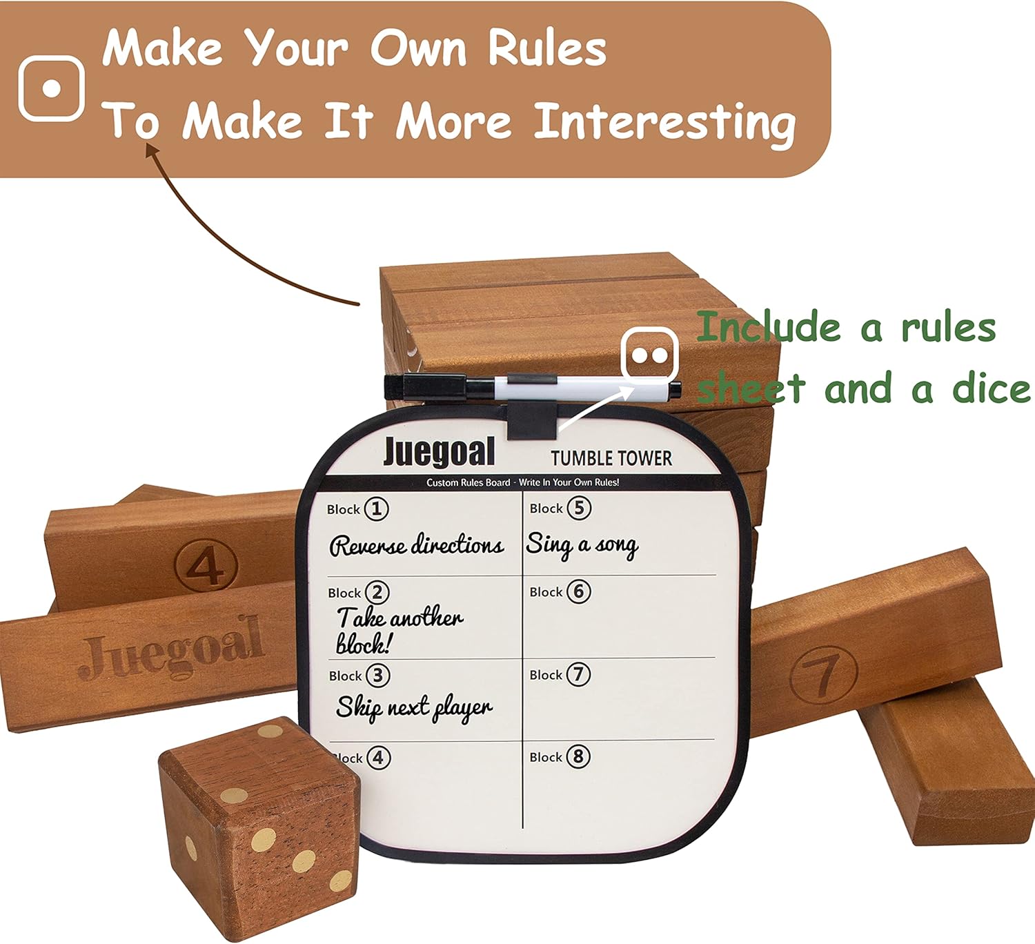 - GIANT TIMBER GAME SET: Juegoal brown color giant tumble tower set comes with 54 pieces wooden tumble blocks, 1 pcs wooden dice, 1 pcs game board with pen and a zipper bag. Each block is 5.9 x 2 x 1.2 inch, 2FT (18 rows) could be grown up to 4FT tall tower when played. A great fun, fast-paced stacking game and indoor or outdoor playing game for all ages.