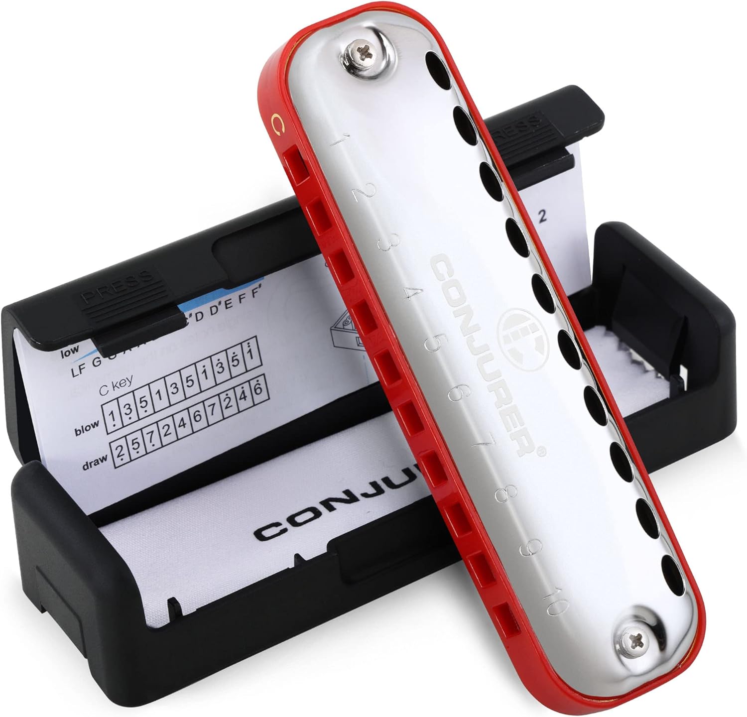 - First harmonica for Child - Each CONJURER harmonica has a matching protective case and has a lovely appearance and sound. The CONJURER harmonica is the ideal present for youngsters, close friends, or harmonica newbies. The goal of CONJURER company is to make premium harmonicas accessible to everyone who enjoys music. The child's first harmonica is a CONJURER.