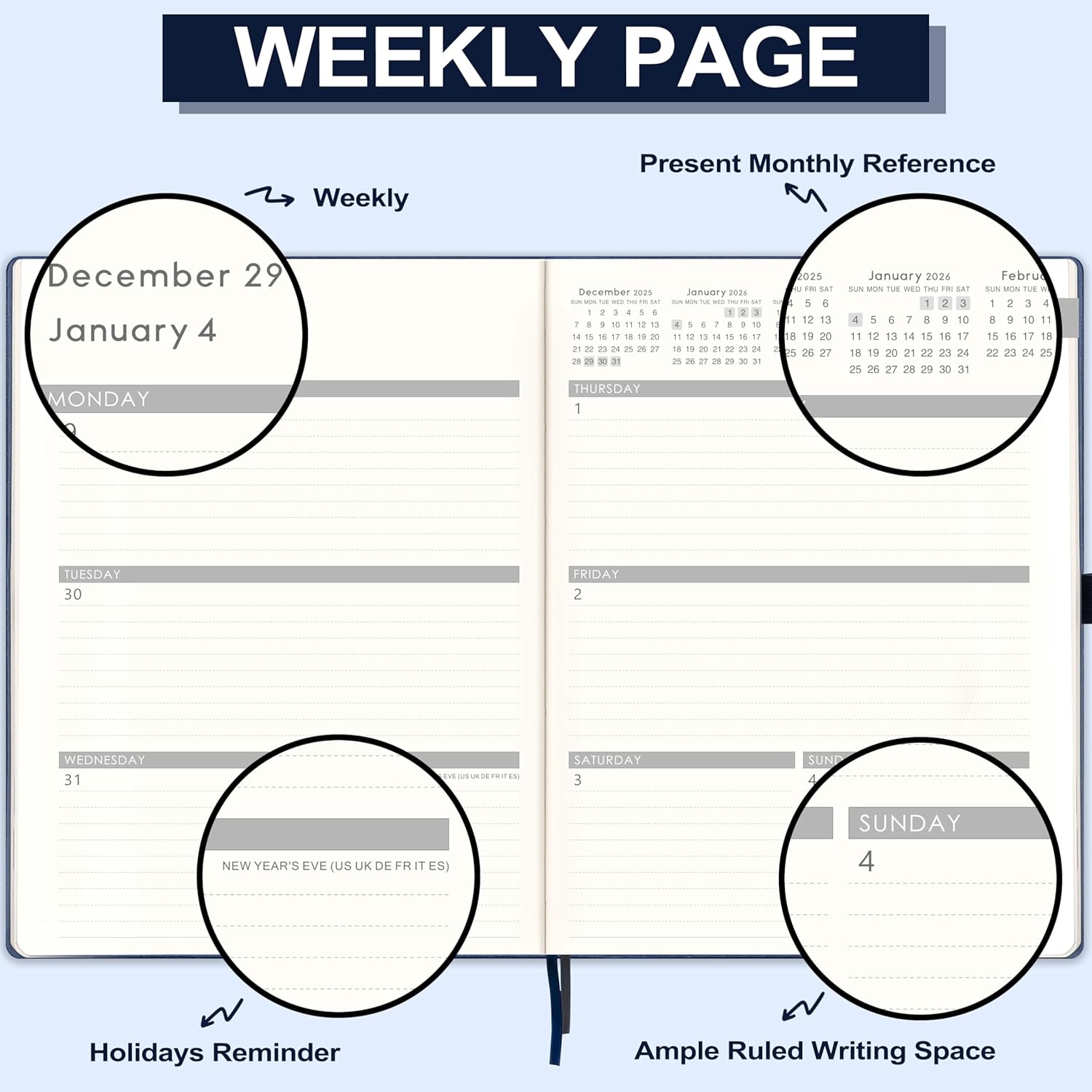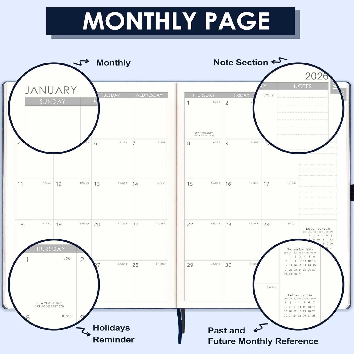 - Functional Details Of 2026 Academic Planner - 8.5" x 11" Weekly & Monthly Pages | Monthly Colorful Tabs | Thickened Hardcover | Thicker Paper | Contacts | Quick Reference Information | Yearly Overview | Reference in the monthly pages. Besides, highlighted holidays and Julian date will help you better organize your life.