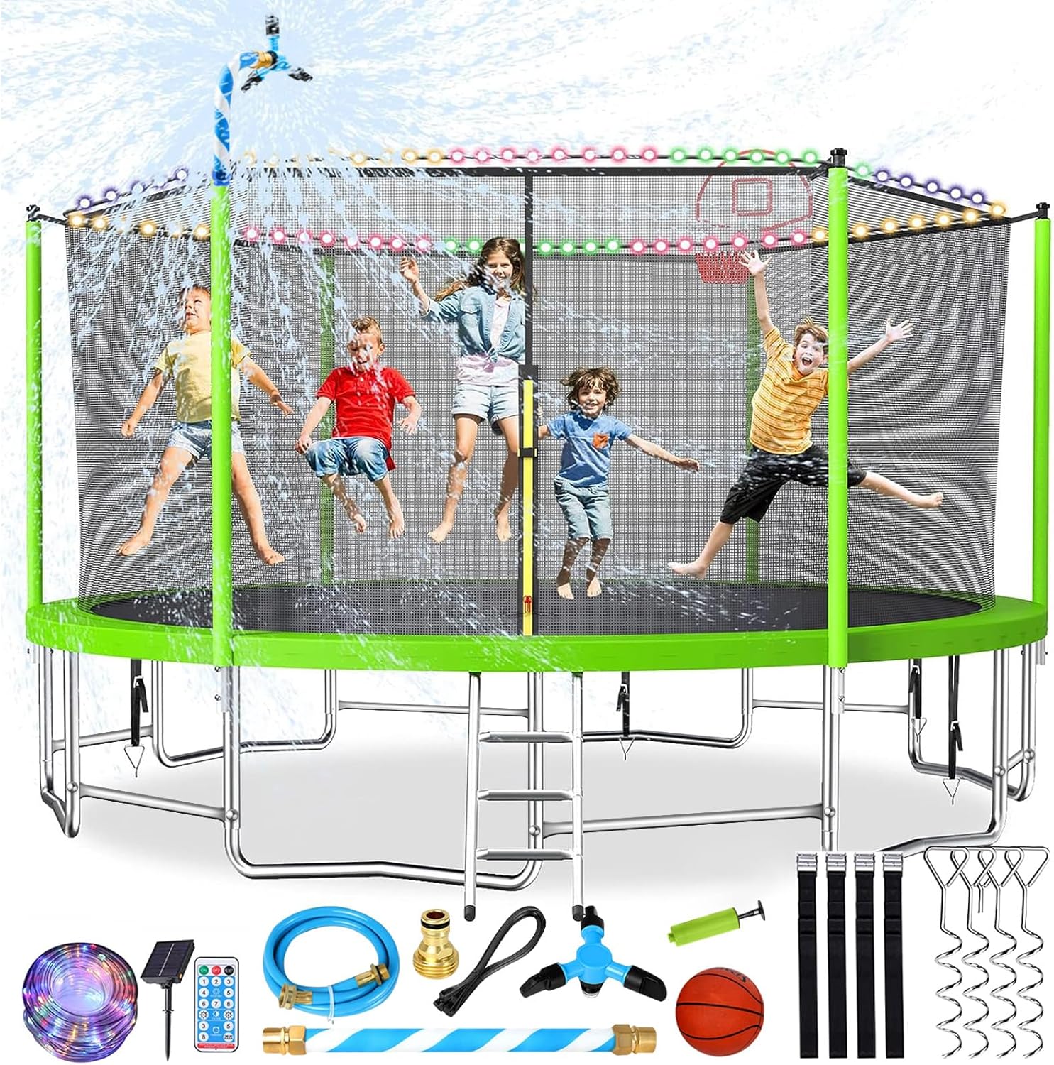 - 【Trampoline Accessories Outfits】Our 16ft trampoline for kids and adults comes with a whole set of accessories which includes: 4 ground stakes, 1 trampoline sprinkler, 1 led light. Bonus packs bring your kids endless giggles