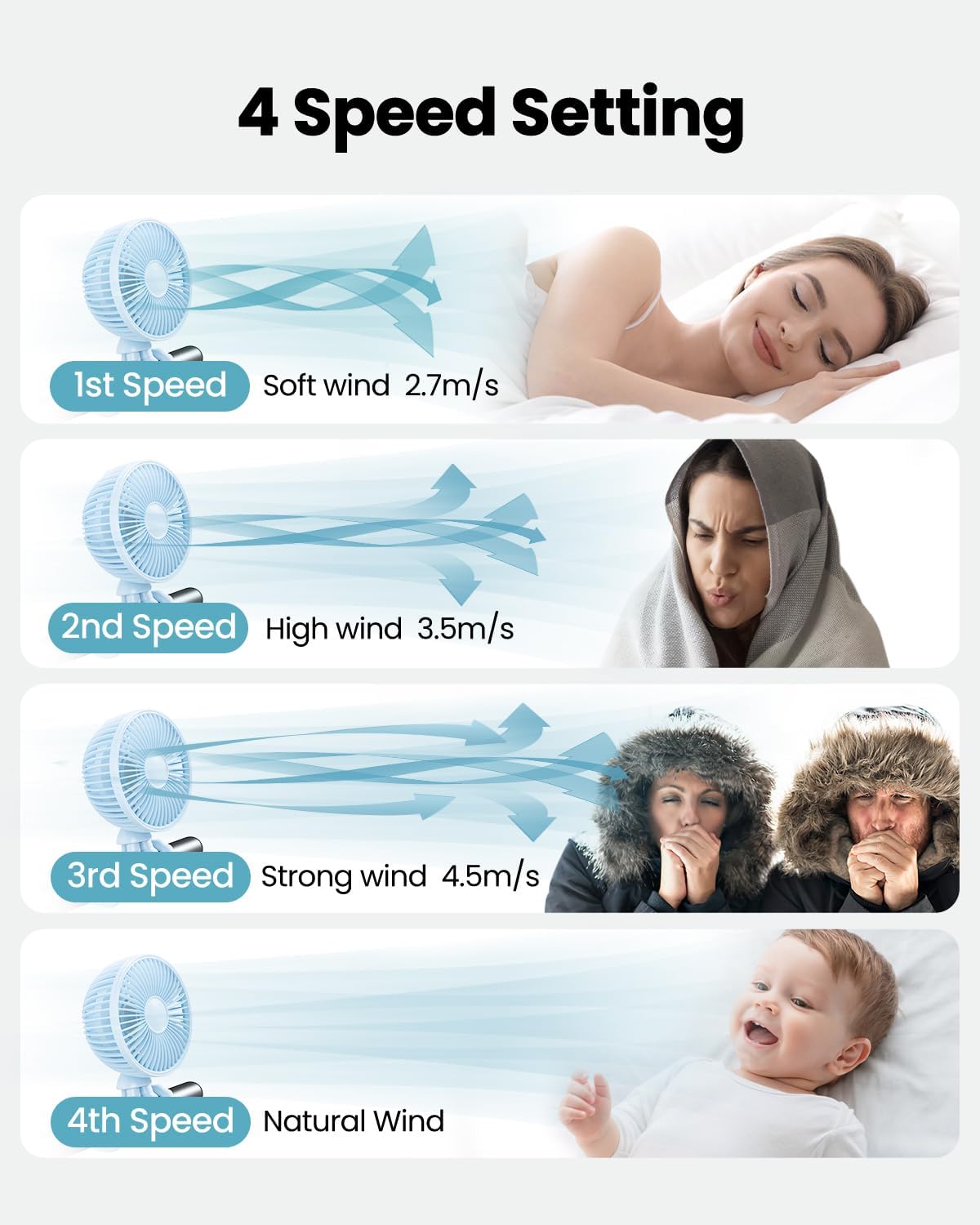 - 4 Adjustable Speeds and Quiet: Baby stroller fan has 4 speed settings: low, medium, strong, natural wind; The 4th speed make the usb fan run and stop for every 4 seconds, put off a good breeze; Quiet clip on fan is great for use with baby strollers