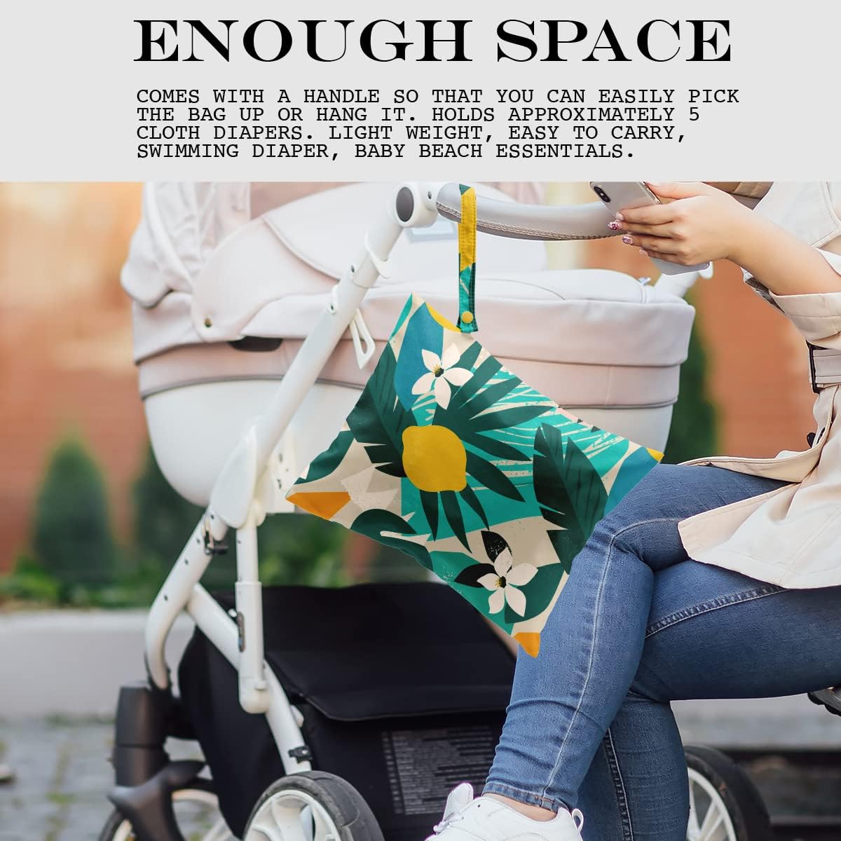 - ENOUGH SPACE - 26cm x 32cm (approx.: 12.5” x 10.2”). Comes with a handle so that you can easily pick the bag up or hang it. Holds approximately 5 cloth diapers. Light weight, easy to carry, swimming diaper, beach essentials.