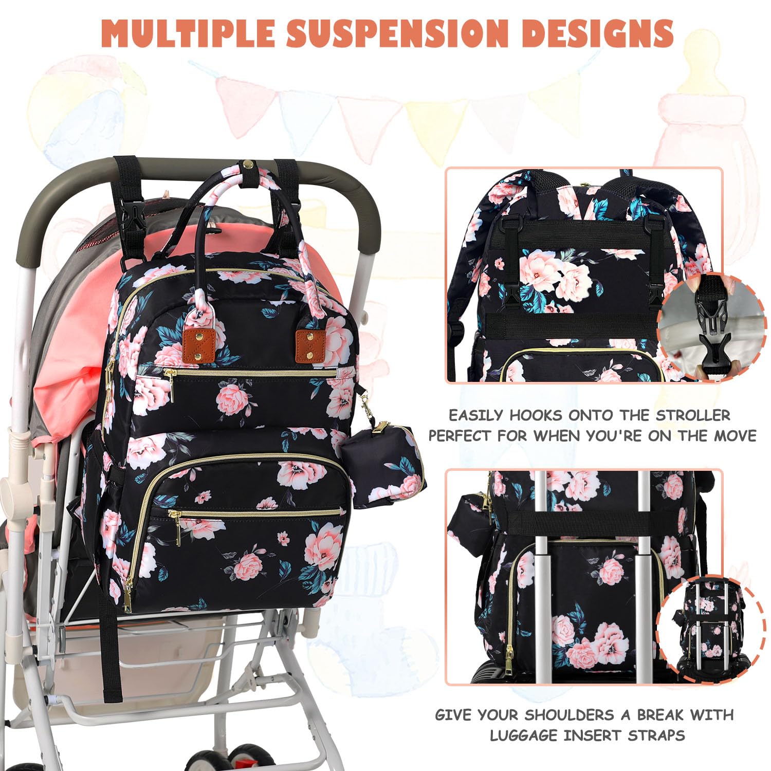 Baby Diaper Bag Backpack, Travel Diaper Bags for Girl Boy Large Capacity Baby Bag Backpack for Women Black Floral