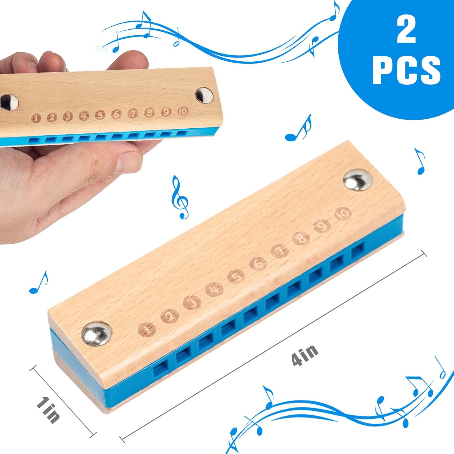 Koogel 2PCS Kids Harmonica, 10 Hole Wooden Beginner Mouth Organ Toy Musical Instruments for Kids Adults Birthday Gifts
