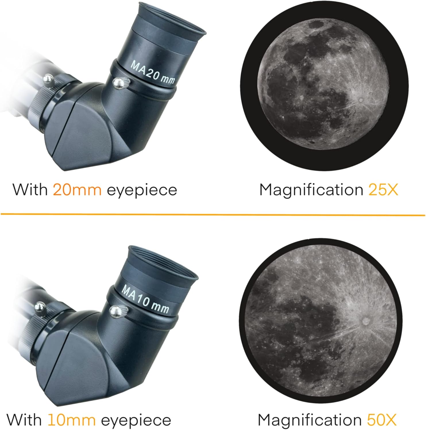 - ăAccessoriesăThis beginner telescope is equipped with all the essentials for embarking on your deep exploration journey. This telescope for beginners included with two highly transmissive glass eyepieces, 10mm and 20mm, ensuring crisp and sharp image unmatched by other telescopes. Capture stunning images of the night sky on the go with ease using the included smartphone adapter, transforming this telescope into a smarphone telescope. Plus, With the included astonishing 3X Barlow Lens, the maximum magnifiation of this telescope can reach 120X, revealing intricate details like you were an astronaunt.