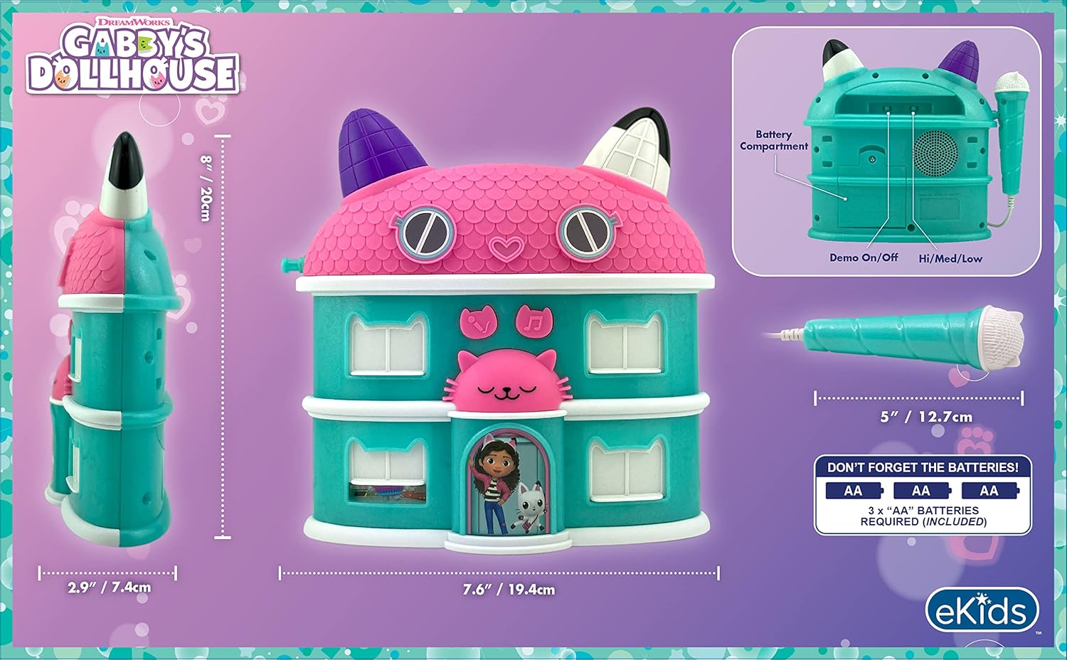 - Sound Effects: Slide up the dollhouse windows to reveal characters and fun sound effects. This karaoke toy has easy to use, kid-friendly controls designed for children 3 and up.