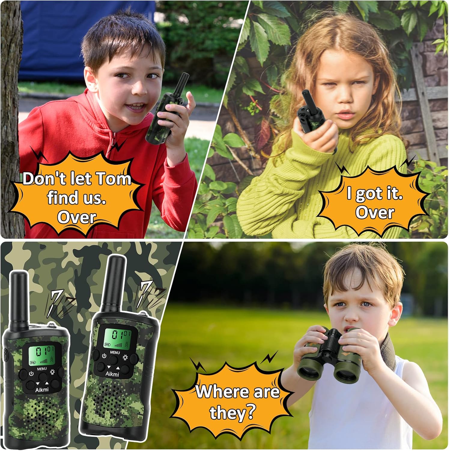 - EXPLORE THE OUTDOORS: Aikmi walkie talkies for kids features 22 channels, 3-mile range, flashlight, VOX hands-free and private channel option. These army toys walkie talkies are easy to use with fit size, good volume, long distance and great battery life. Plus, they come with a tactical pouch and kids binocular for even more outdoor fun