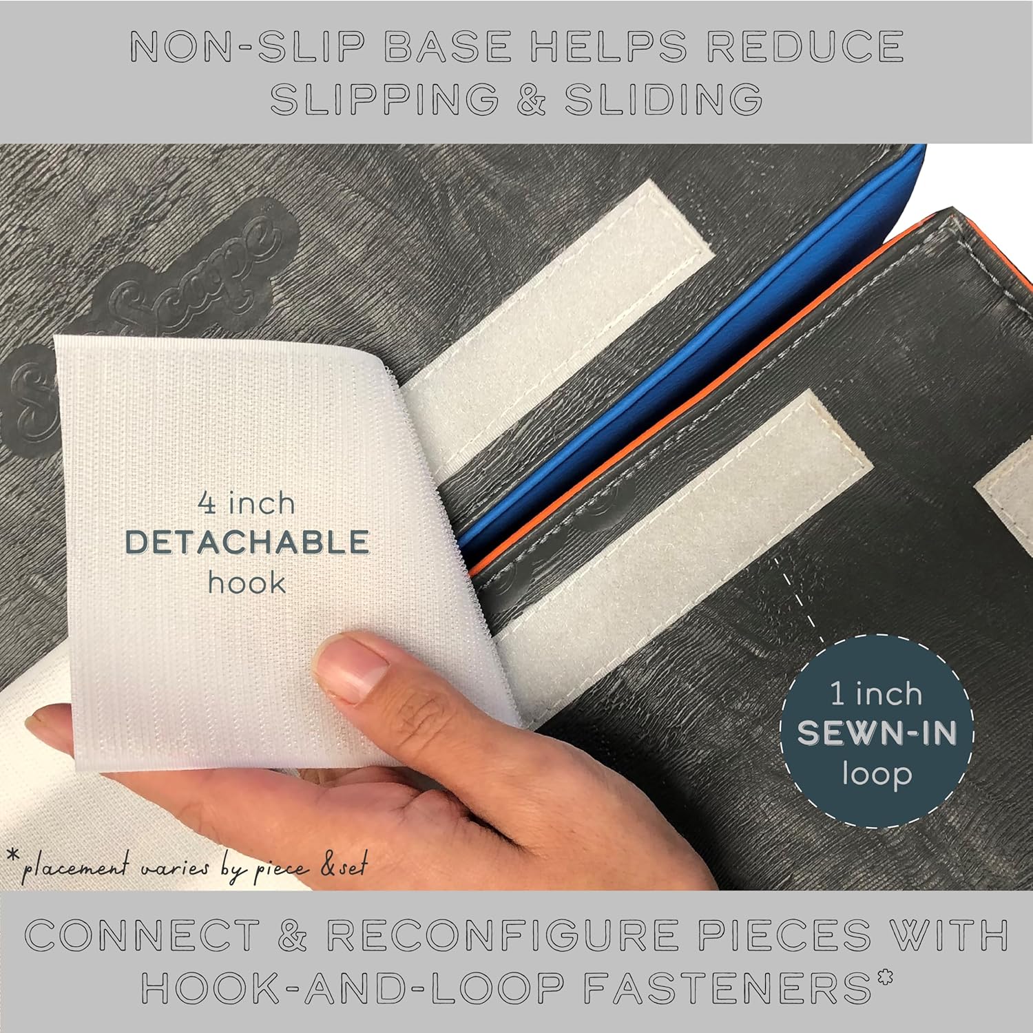 - NON-SLIP BASE: textured non-slip bottom reduces slipping and sliding while at play; comes with hook-and-loop fasteners which can be rearranged to build different configurations and keep pieces in place