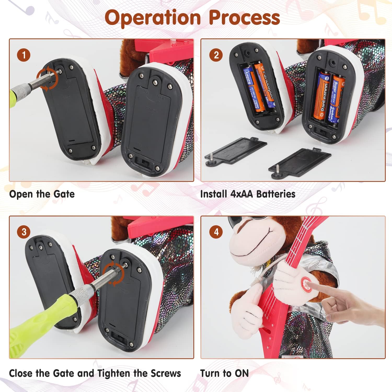 - 【Operation】Press the button on the hand, and the guitar monkey starts to sing and shake the body and play the guitar, press the button again to stop playback, and press another time to switch to the next song, which has a total of 6 songs, can press the button to interrupt it, or wait until it has finished the song by itself.