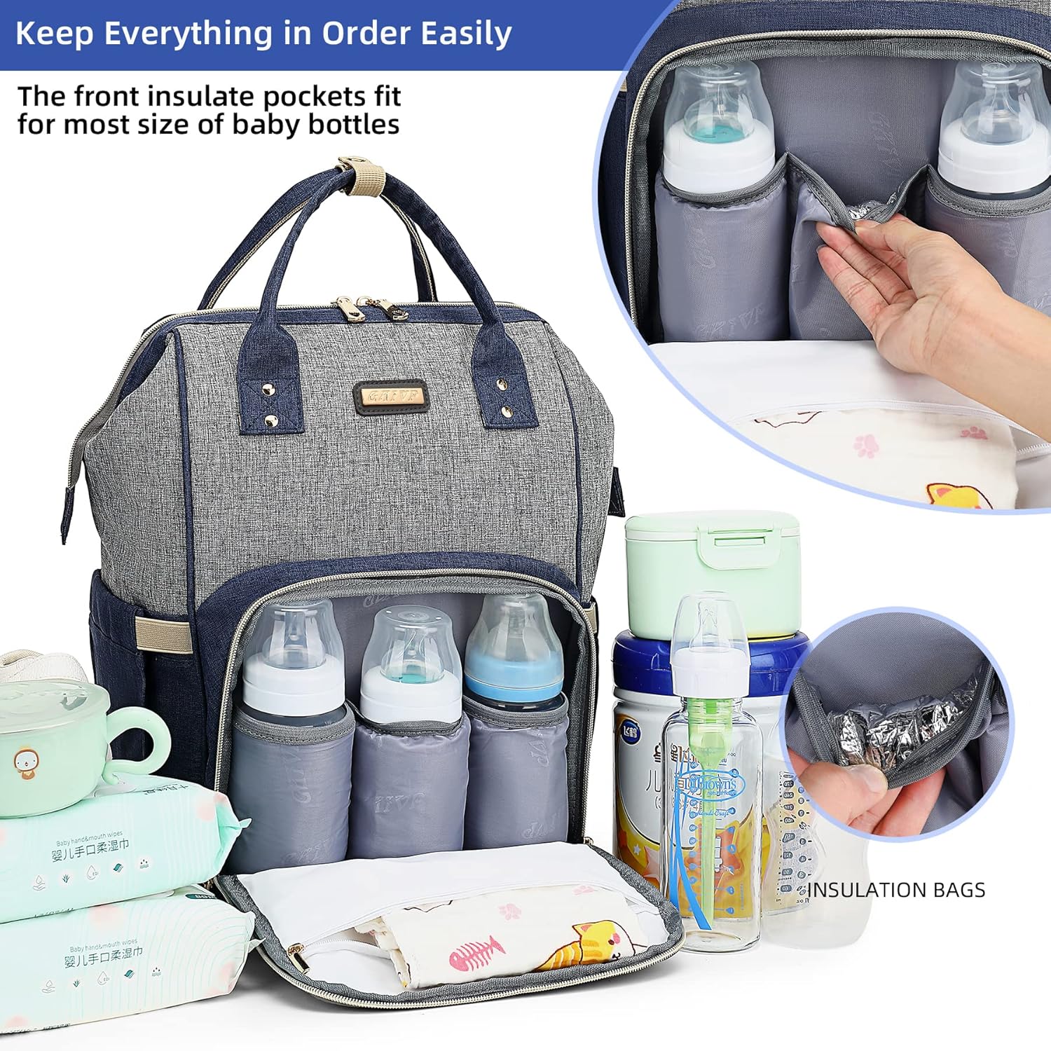 - 【Stylish, Functional, Lightweight, And Spacious Large Baby Bags for Boys Girls】*1 main compartment(could put 4-5 baby suits or something else), *2 inner compartments for nappies (could hold 4-5pcs diapers), *1 inner compartment for small containers and bottles, *1 zipper wipe pocket allows parents to quickly take care of dirty diapers and clothes,*1 zippered compartment for valuables,*1 insulated front pocket for keeping bottles hot or cold for up to 4 hours