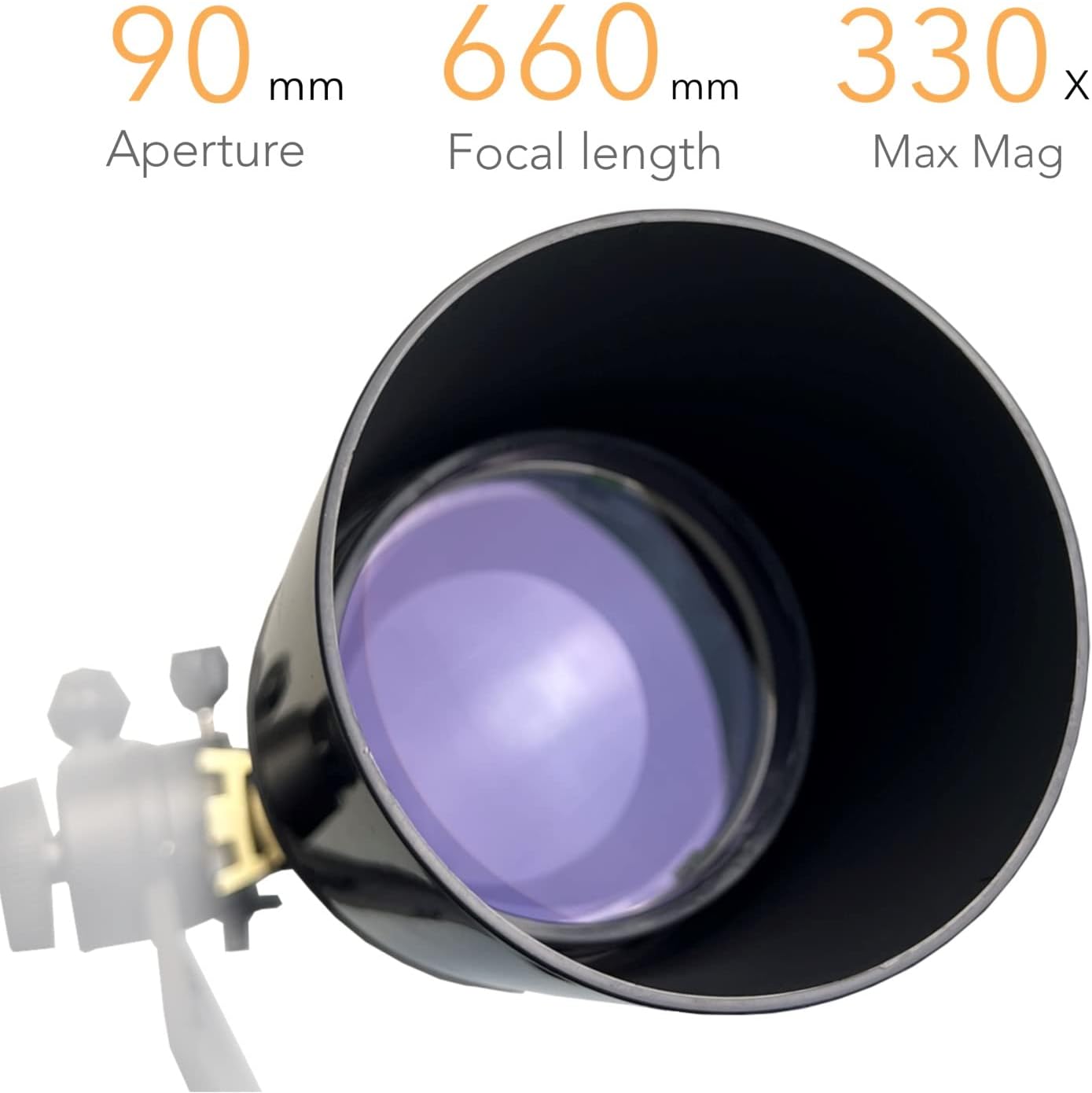 - ăFully Multi Coated Glass Optics ăExperience the breathtaking beauty of the night sky with this professional telescope for kids, celebrated for this outstanding fully Multi Layer coated glass optics featuring Magnesium Difluoride coatings. These advanced Refractor telescope deliver images of unparalleled clarity and sharpness, making celestial observations a truly immersive experience. Boasting a 90mm aperture and 660mm focal length, this telescope is perfectly suited for a wide range of celestial wonders, including the Moon, Jupiter, Mars, and other stars when weather conditions allow. It's the ultimate telescopio profesional para ver planetas.