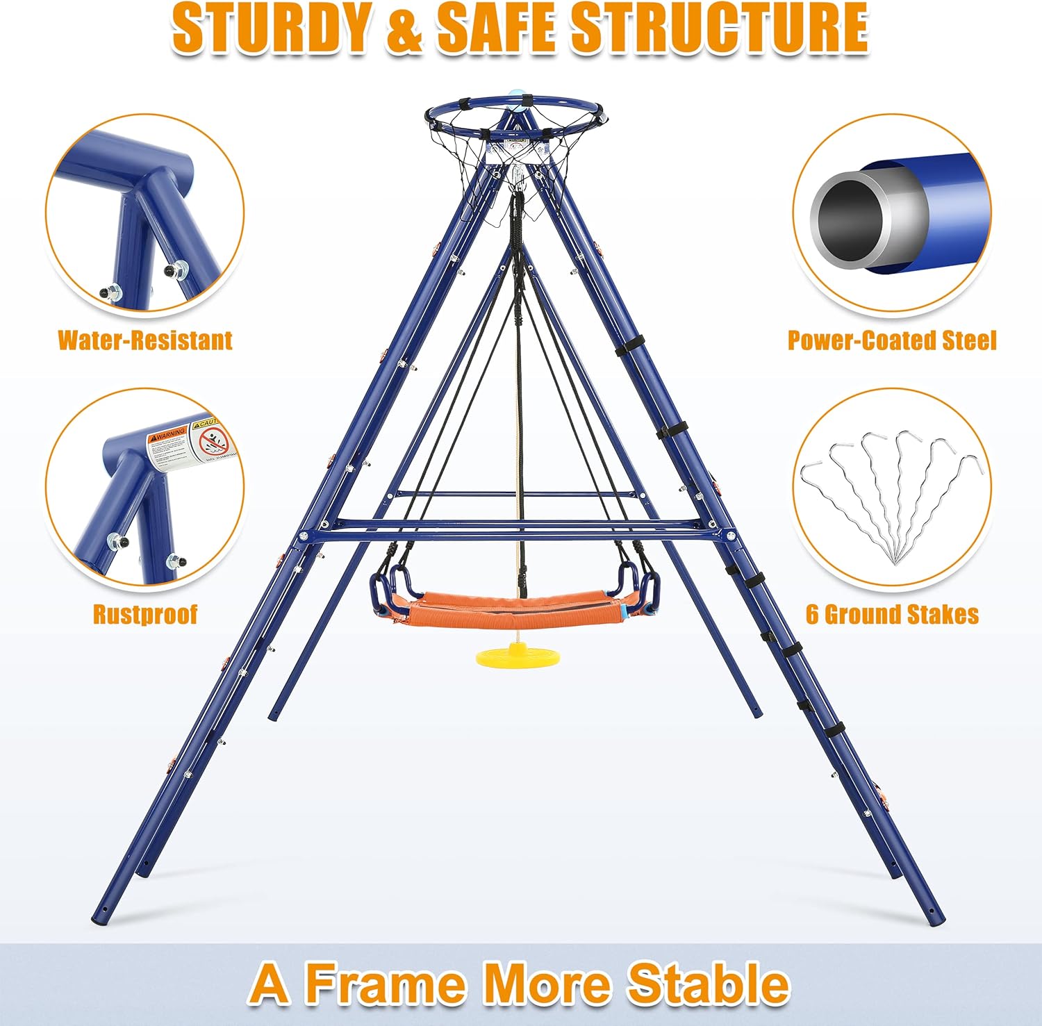 Swing Set for Backyard 550lbs - 6 in 1 Playground Sets for Backyards Safe Platform Swing for Kids Outdoor Heavy Duty Metal Frame with 3 Adjustable Swings Climbing Net Climbing Ladder Basketball Hoop