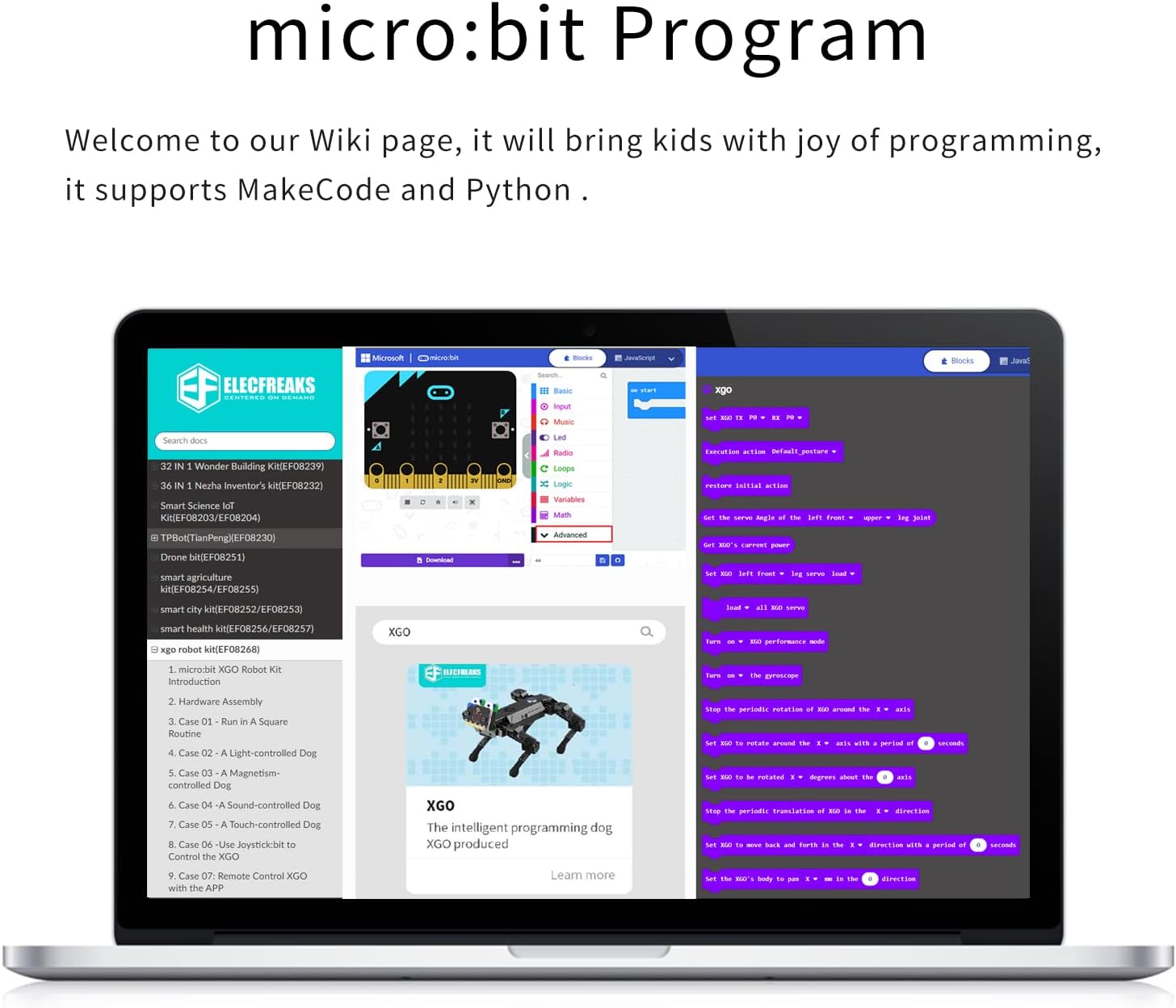 - 【19+ Build-in Actions】 The build-in actions are 19+ kinds such as to get down, shake hands, pee and look for food, it is easy to operate via APP ,or ELECFREAKS joystick and microbit program.