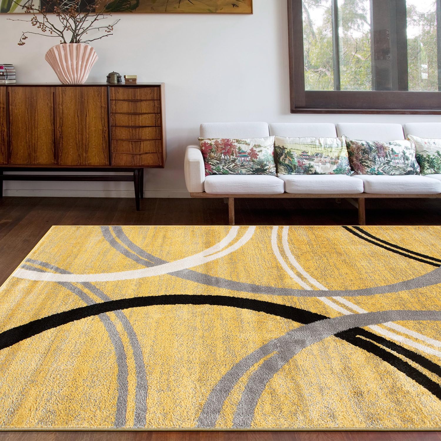 - Dynamic Wavy Circles Design: The rug boasts an artistic pattern with fluid wavy circles, available in blue, brown, gray, red, black, and yellow to complement any room's palette.
