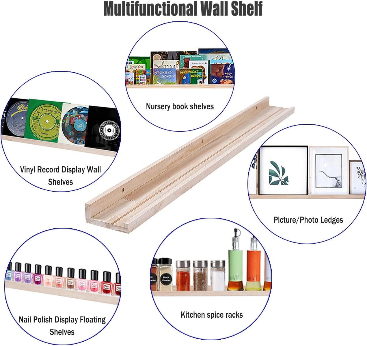 - Ideal for Wall Decor: The size of photo ledges is 48 in x 3.7 in x 1.6 in.This wall floating shelf has no visible floor support, so it makes greater use of your wall space and adds a decorative touch to your home. This wall floating shelf in natural wood color is suitable for various styles of furniture decoration, simple and generous.