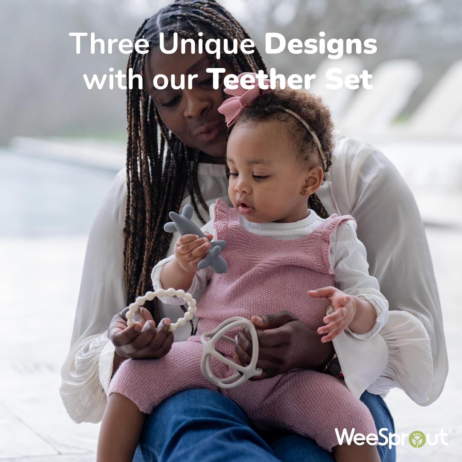 WeeSprout Silicone Baby Teether Toys for Infant Babies and Toddlers, Cute Ring, Puppy Dog, and Ball, Soft and Flexible, BPA Free, Boys and Girls (Matte Green, Pink & Off White)
