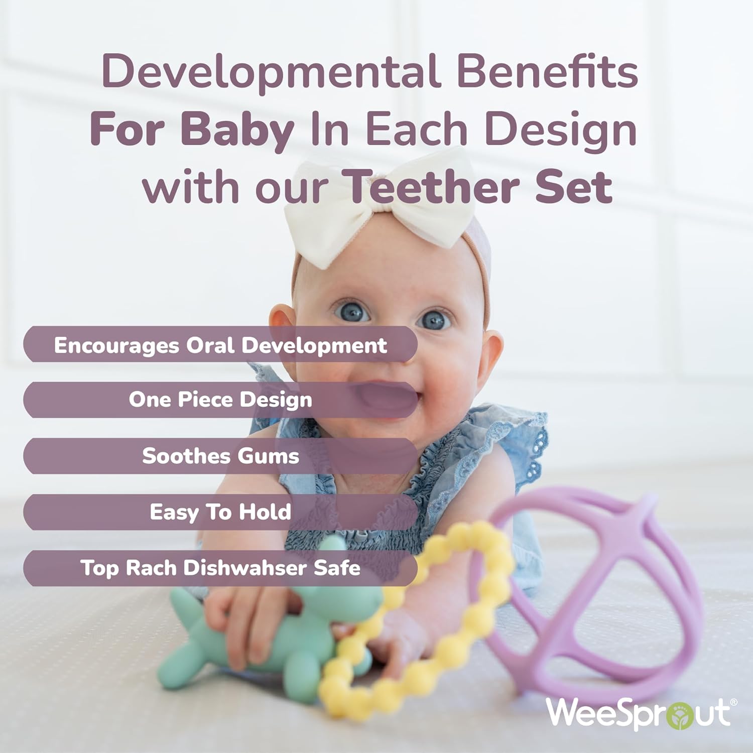 WeeSprout Silicone Baby Teether Toys for Infant Babies and Toddlers, Cute Ring, Puppy Dog, and Ball, Soft and Flexible, BPA Free, Boys and Girls (Bright Green, Purple & Blue)
