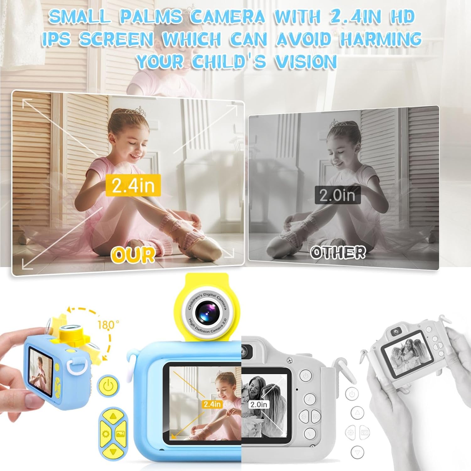 - 【180 ° Flip lens】The common kids camera is a dual camera design. For children aged 3-6 years, it is a complex operation to switch the self portrait mode. 180 ° flip lens can easily solve this problem. Even a 3 yr baby also can easily use the self portrait mode by simply turning the lens angle. The pixels of the self portrait are as clear as the rear. The simple operation can stimulate children's curiosity and enthusiasm to explore the world.