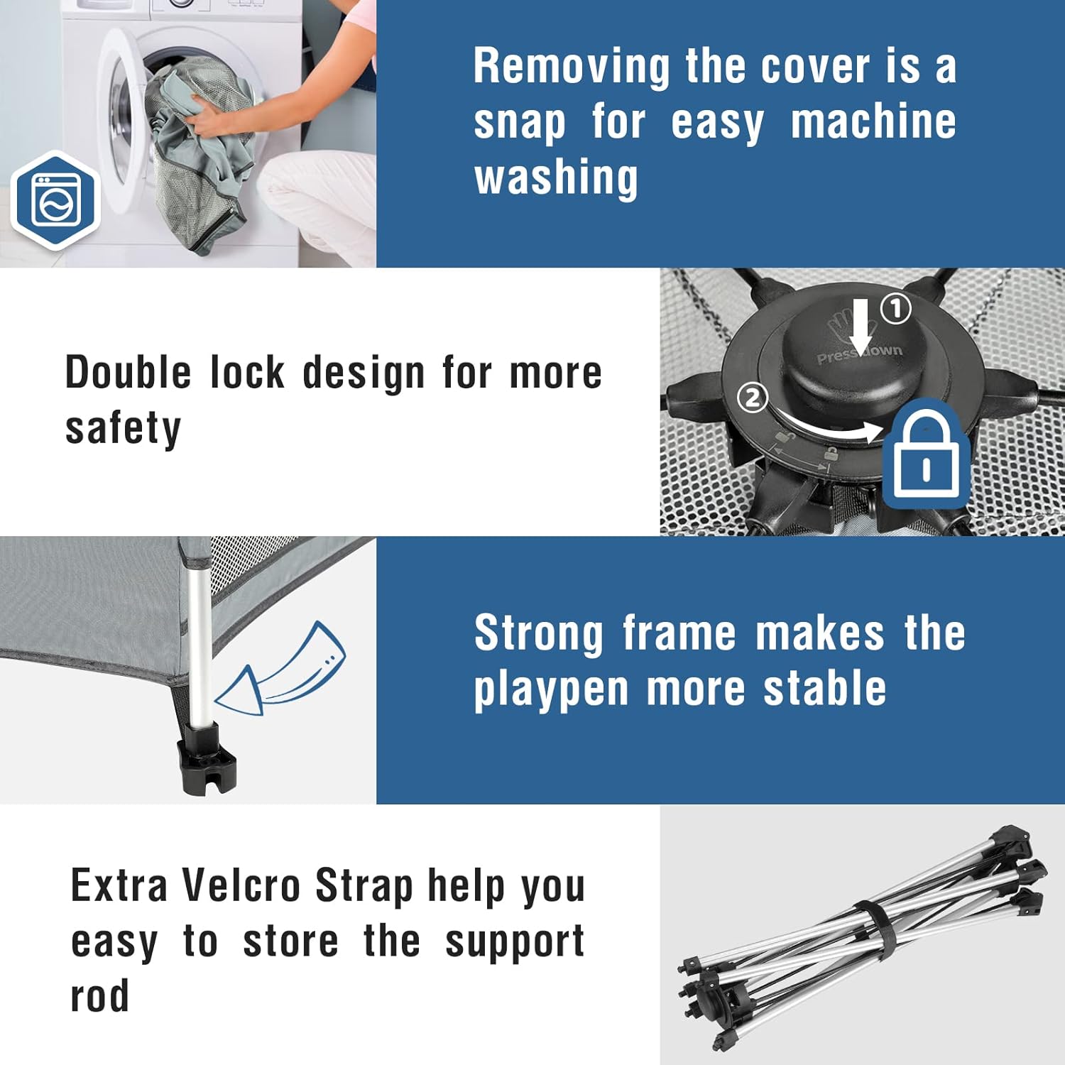- FOUCOS ON SAFETY - The DOUBLE LOCK of the portable play pen designed for more safety and you no need to insert the safety clip attached to the middle bar to secure. You just keep pressing down & turn right to lock the pop up play pen. Turn left to unlock the baby outdoor playpen