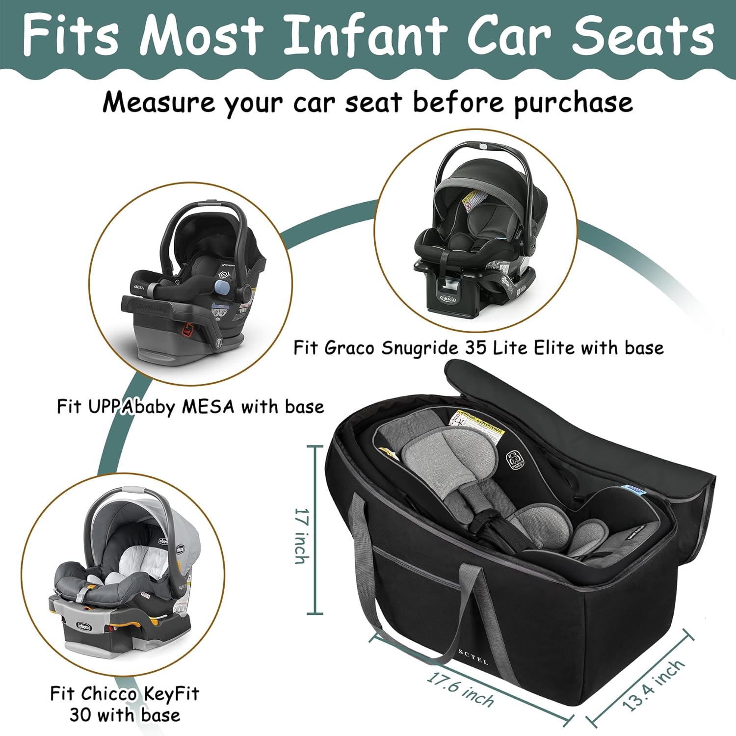 - Size Compatibility: This car seat travel bag comes in 17.6x13.4x17 inches, which perfectly fits Graco SnugRide 35 Lite Elite with base, fit Chicco KeyFit 30 with base, fit Cybex Aton 2 with base, fit Uppababy MESA with base, fit Uppababy MESA V2 without base, fit Nuna Pipa all models without base. It an essential for air travel with car seats. For other infant car seats, please measure the size before purchase.