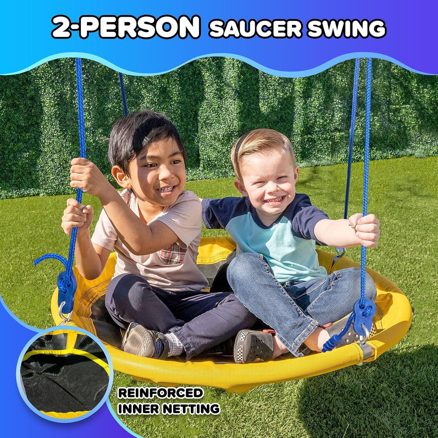 - HEAVY DUTY: Sportspower Swing and Saucer Metal Swing set has heavy duty swing ropes that are UV resistant and adjustable