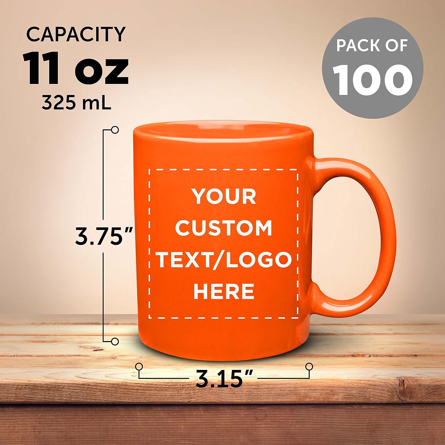 Custom Ceramic Coffee Mugs 11 oz. Set of 100, Personalized Bulk Pack - Coffee cup set, Iced coffee cup, Gaming mug - Orange