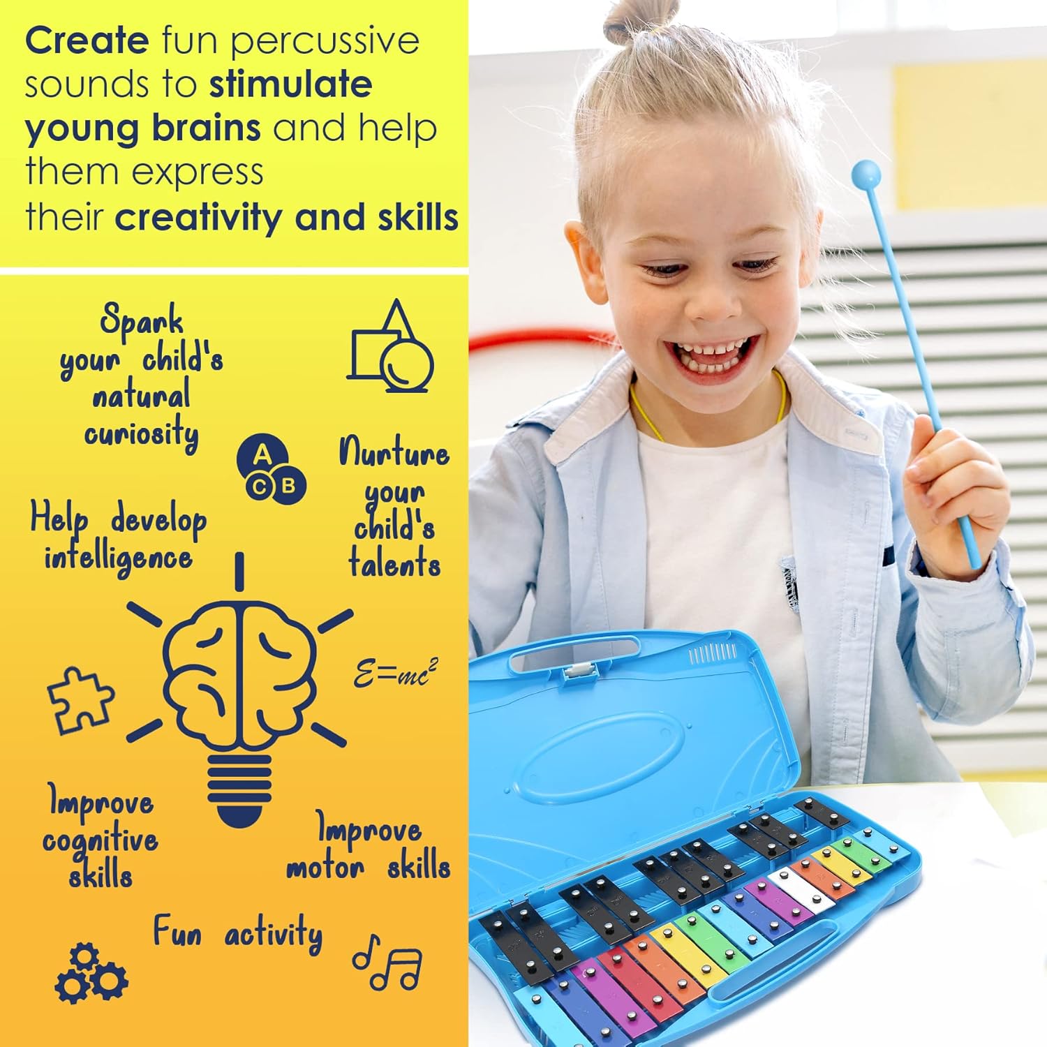 - NURTURE YOUR CHILD’S DEVELOPMENT: Music toys like this toddler xylophone have numerous benefits for children's brain development. Playing the xylophone for kids ages 5-9 can improve coordination, motor skills, and cognitive abilities, while the colorful keys make learning to play both fun and rewarding. This kids glockenspiel is an excellent educational toy that inspires a sense of accomplishment and joy in young learners. It’s the perfect percussion musical instrument, xylophone for toddlers.