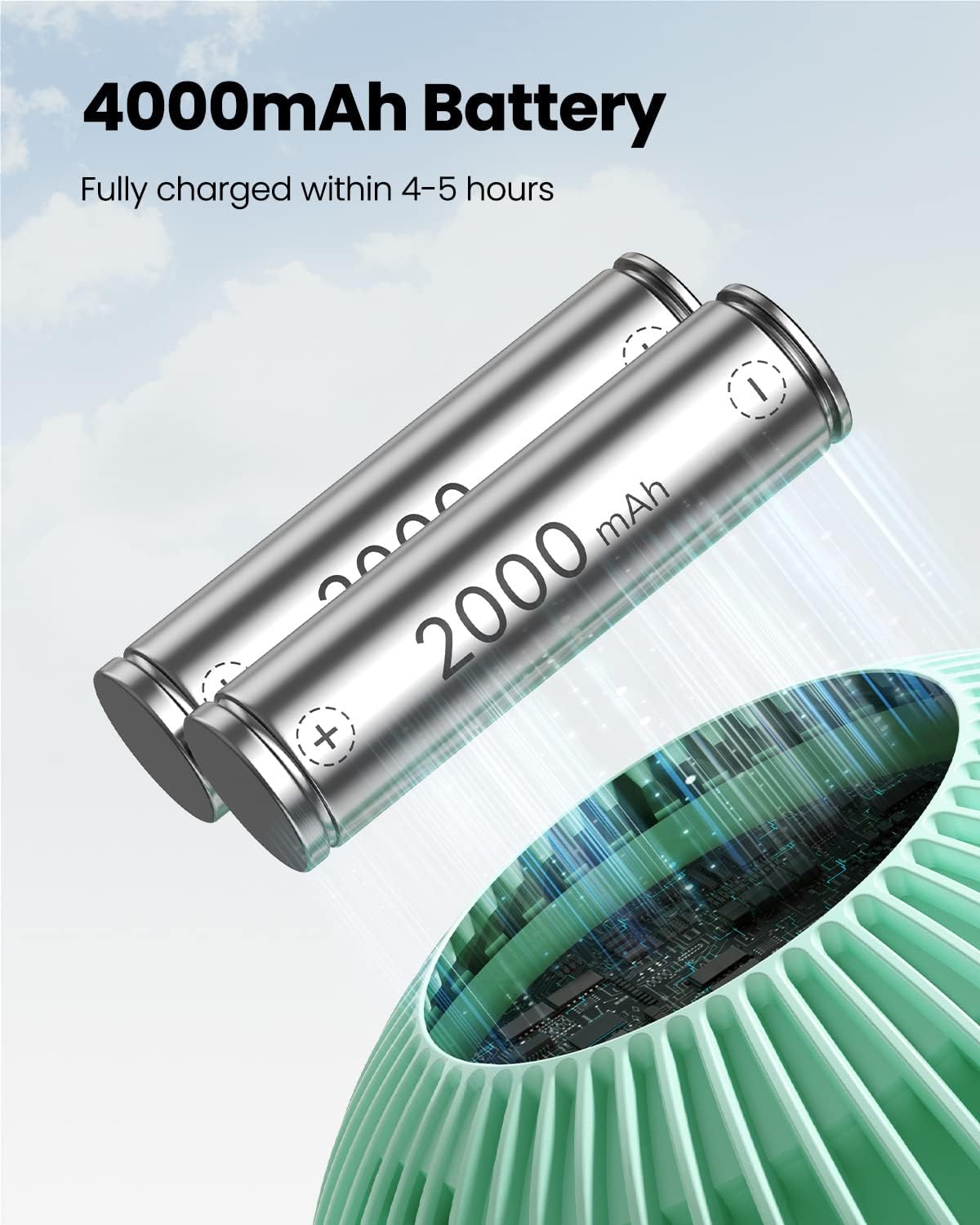 - 3-12 Hours Working and 4.5 H Fast Charging: This portable fan has large cell capacity; The rechargeable fan lasts 3-12 hours depending on the 4 speeds, and fully charged within 4.5 h; The small fan is charged by a quality USB Type-C port
