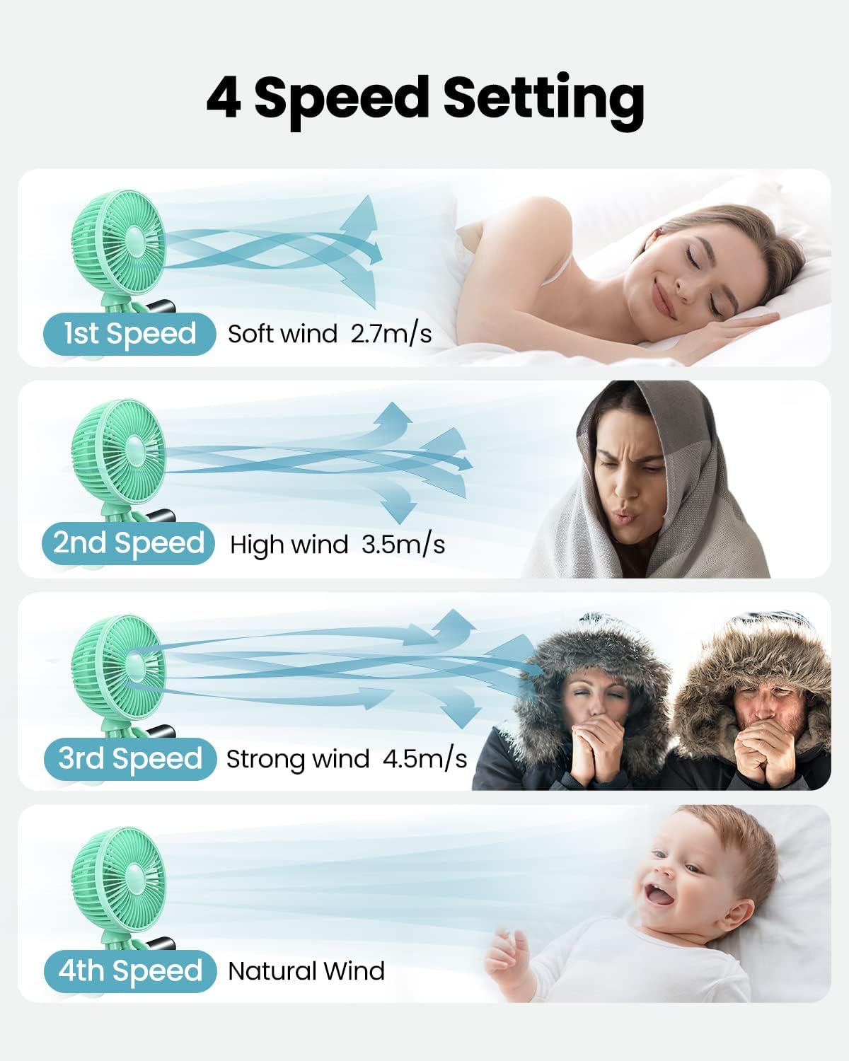 - 4 Adjustable Speeds and Quiet: Baby stroller fan has 4 speed settings: low, medium, strong, natural wind; The 4th speed make the usb fan run and stop for every 4 seconds, put off a good breeze; Quiet clip on fan is great for use with baby strollers