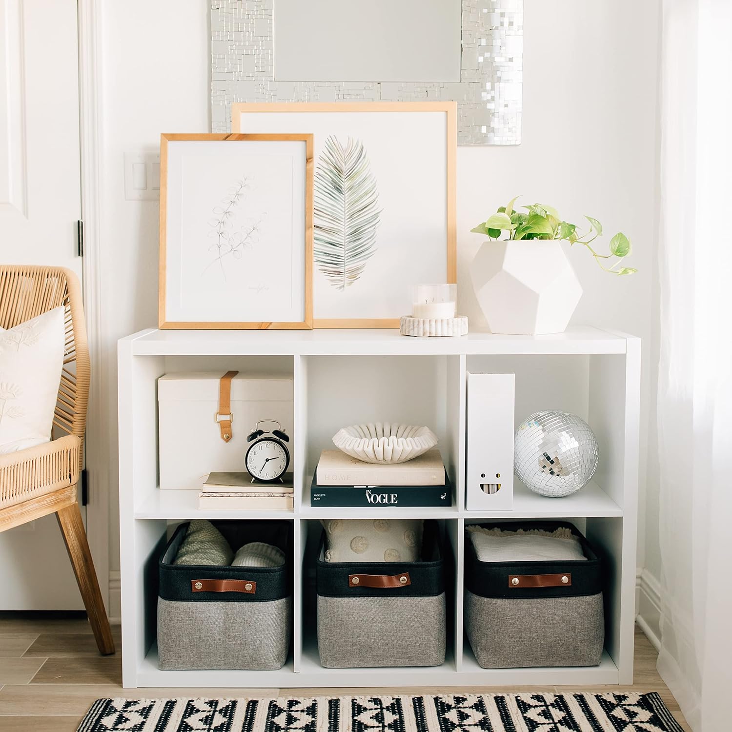 - Decorative Fabric and Vegan Leather β These versatile storage baskets for organizing your everyday life are made with a thick, high-quality fabric and fitted with leather handles to add a stylish touch to a living room, bedroom, office, or personal space.