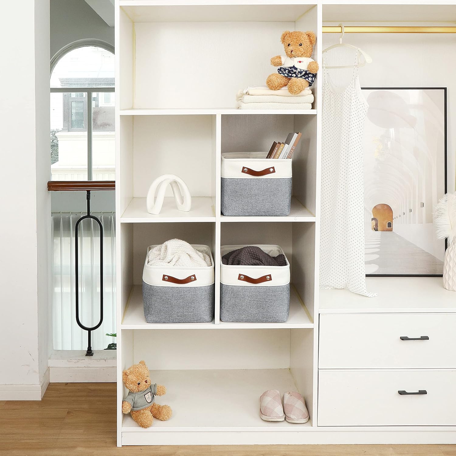 - Decorative Fabric and Vegan Leather β These versatile storage baskets for organizing your everyday life are made with a thick, high-quality fabric and fitted with leather handles to add a stylish touch to a living room, bedroom, office, or personal space.